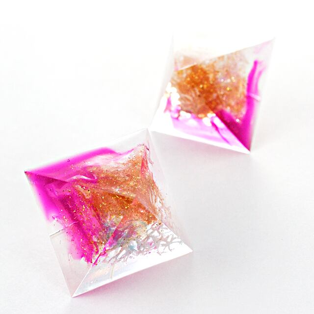 ライトパープルカラー、ホワイトのカラーやモス、ラメ、自作パーツなどをクリスタルレジンで閉じ込めたピラミッド型のピアスです。