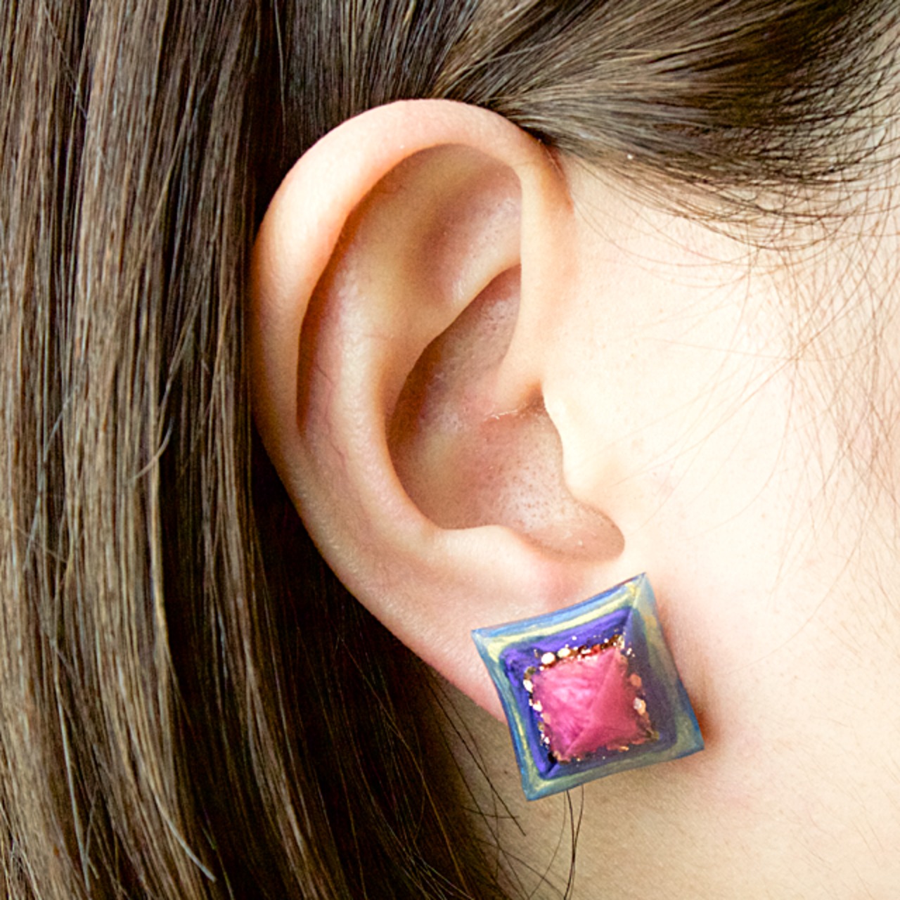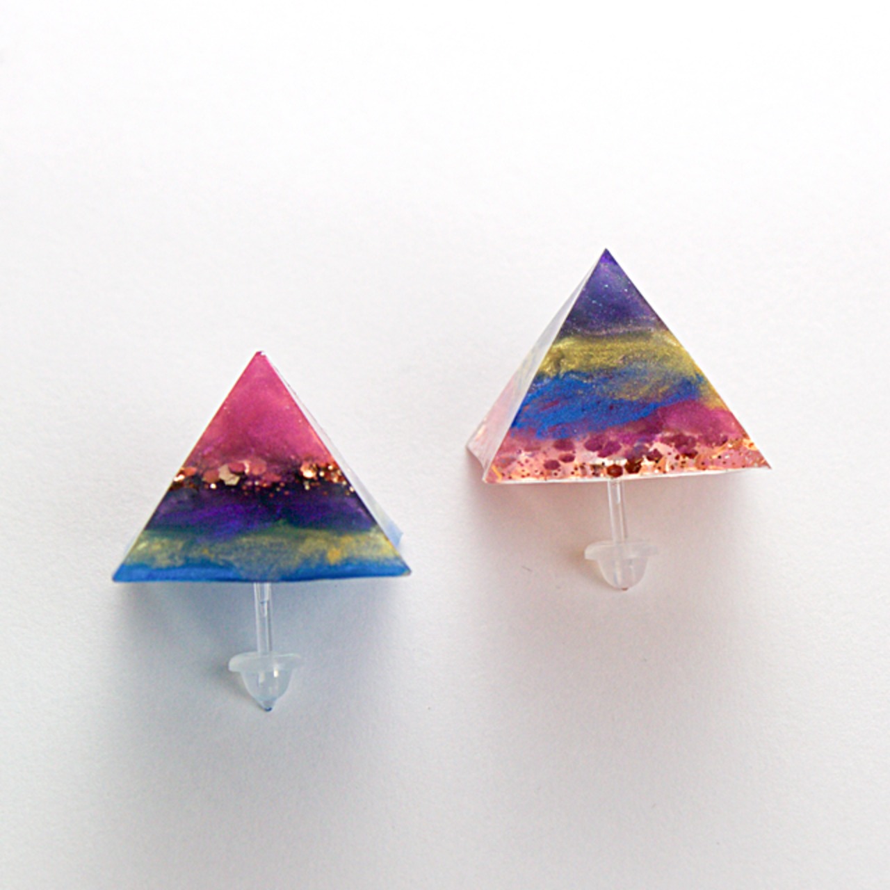 様々なカラーを重ねたクリスタルレジンのピラミッド型のピアスです。