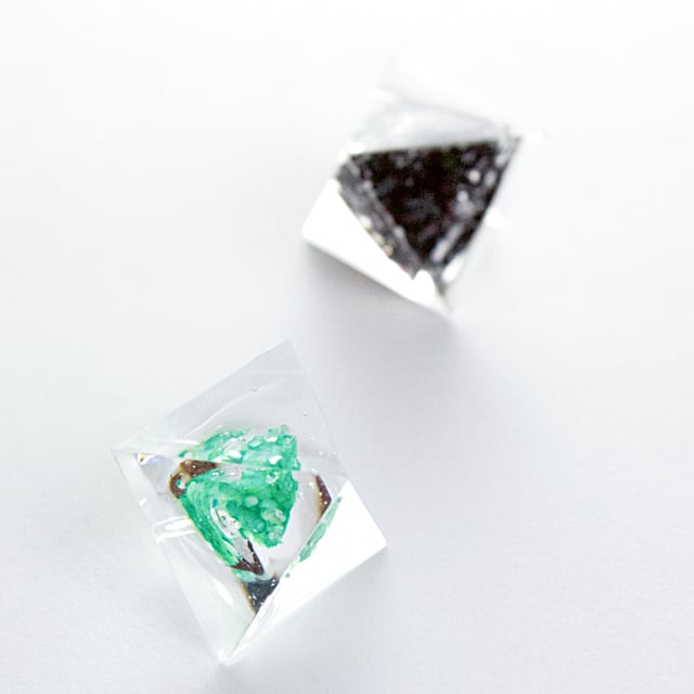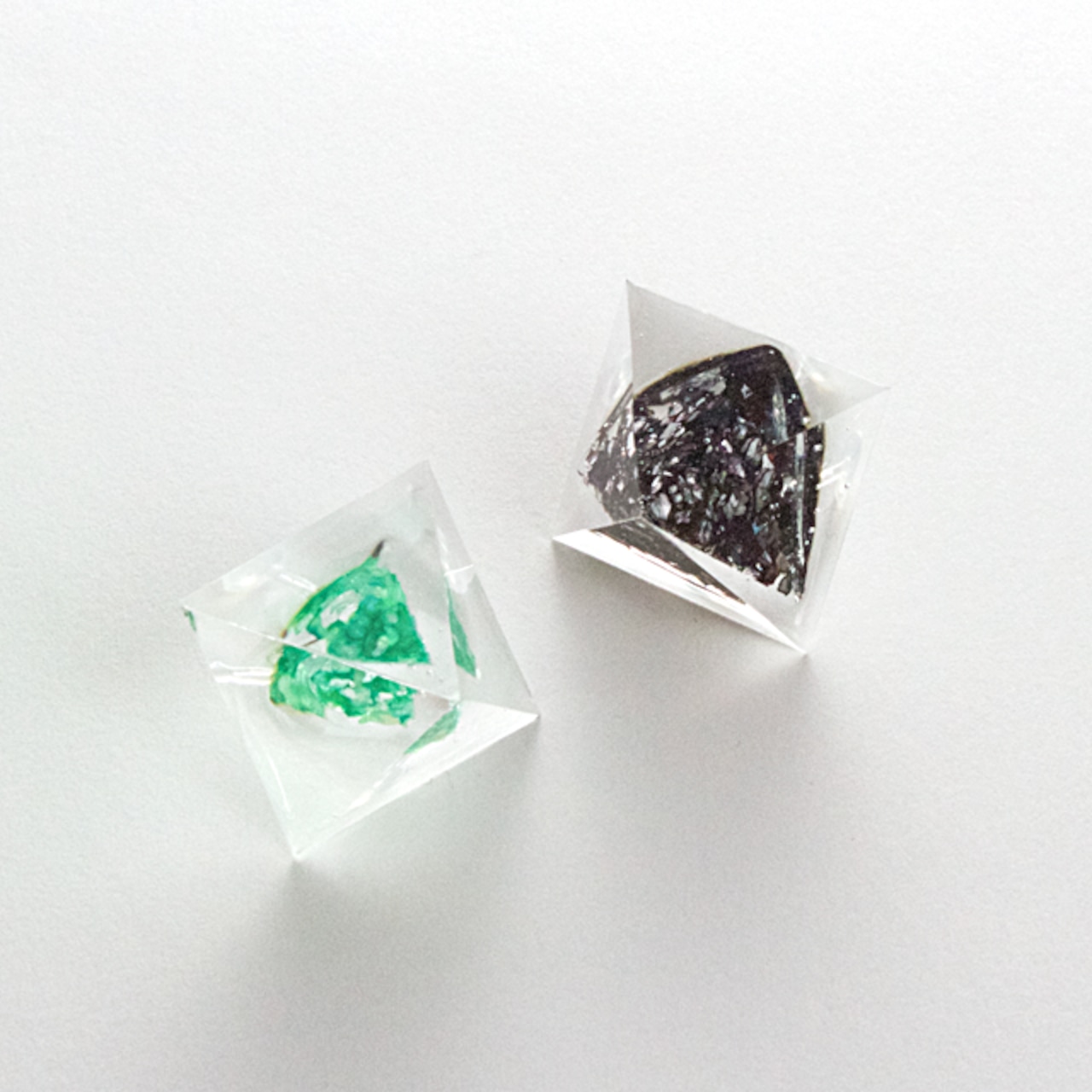異なるカラーリングの三角錐をクリスタルレジンで閉じ込めたピラミッド型のピアスです。