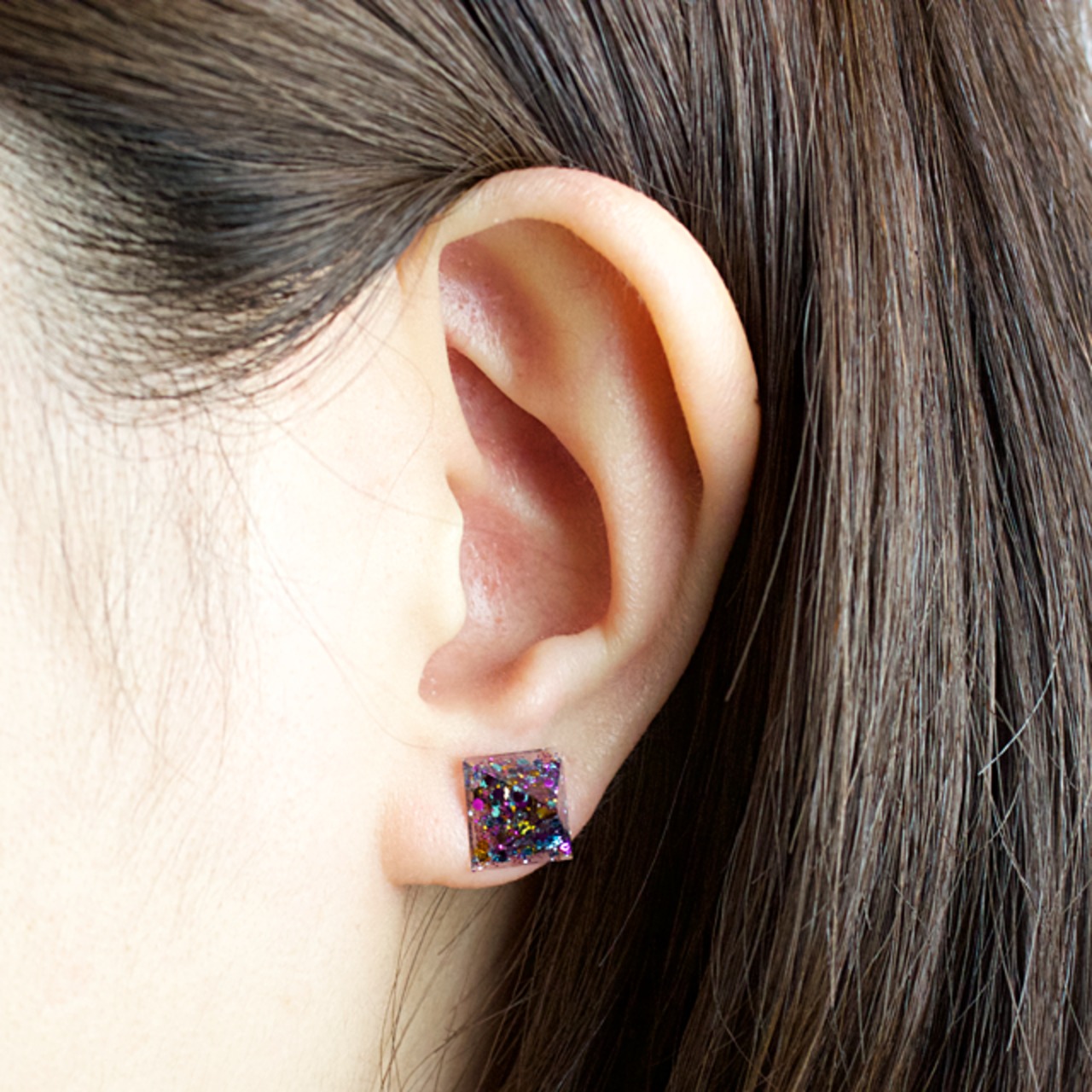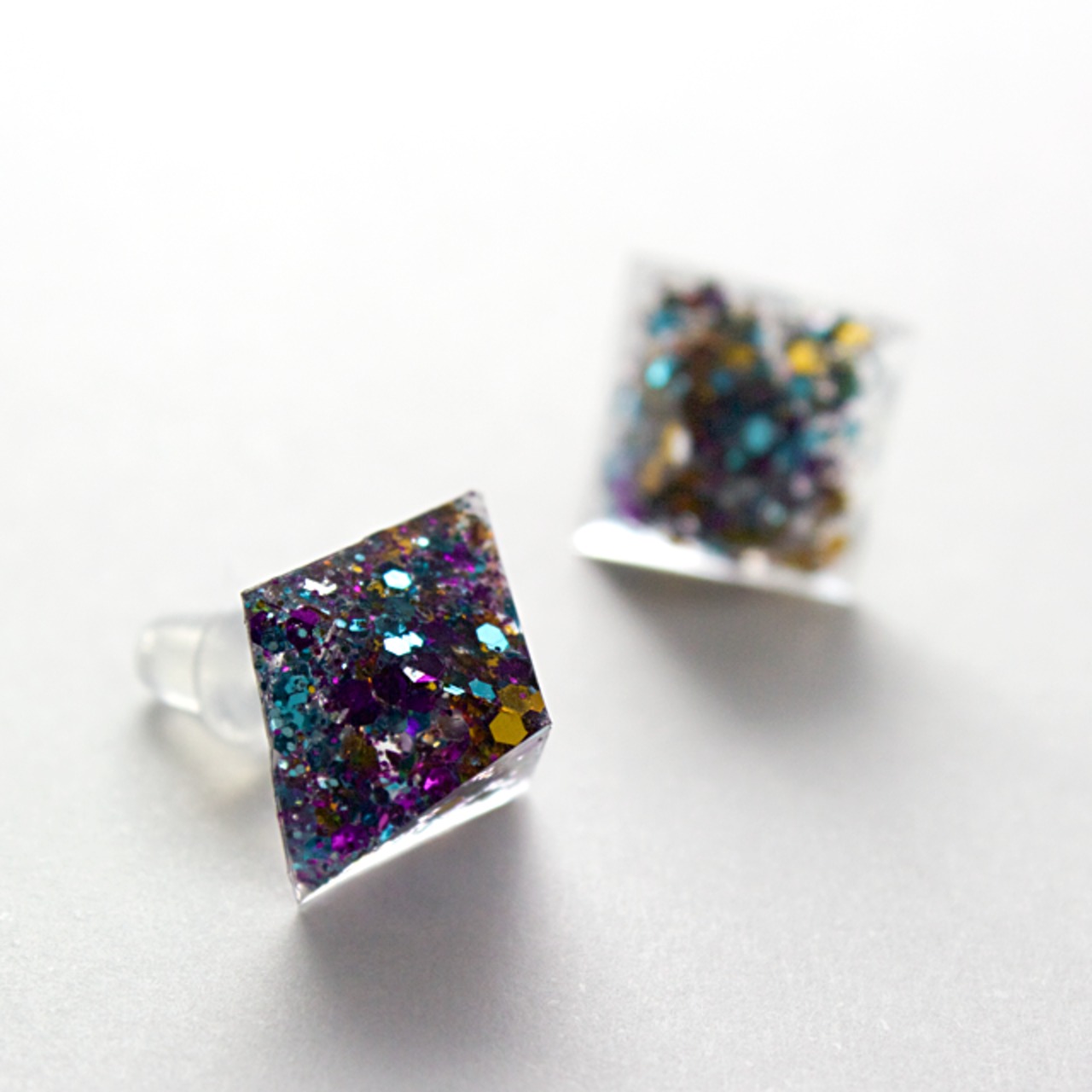 様々なラメを封じ込めたクリスタルレジンのピラミッド型のピアスです。