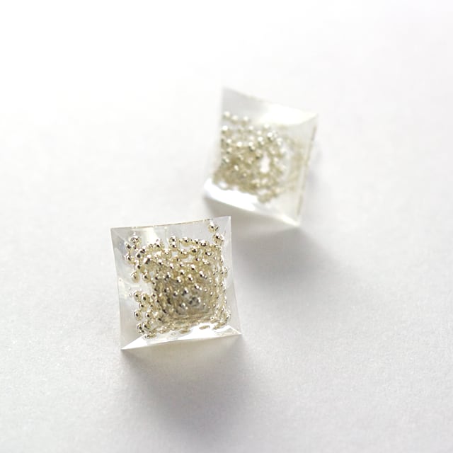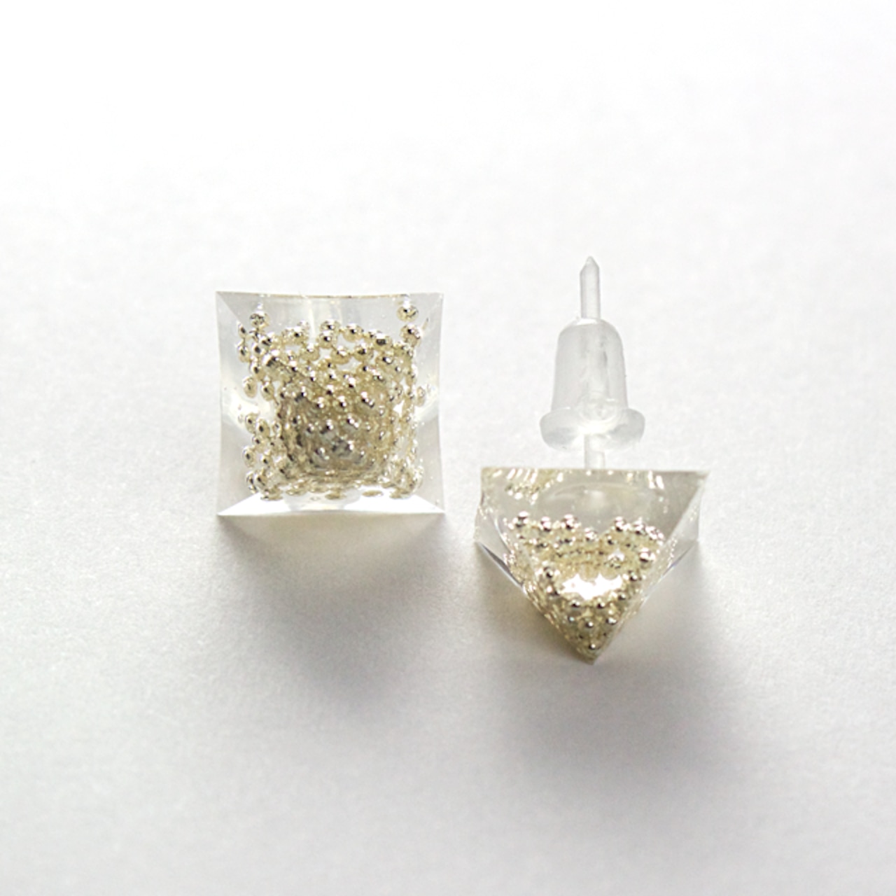 クリアのクリスタルレジンのピラミッド型のピアスです。