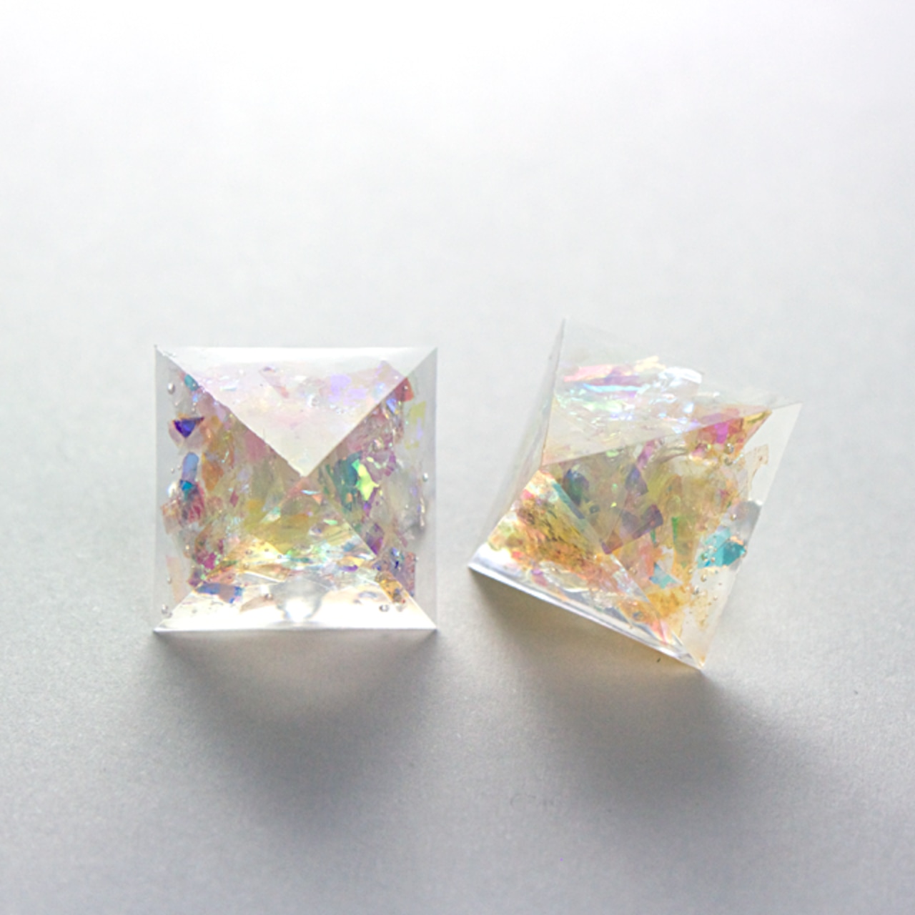 クリスタルレジンのピラミッド型のピアスです。