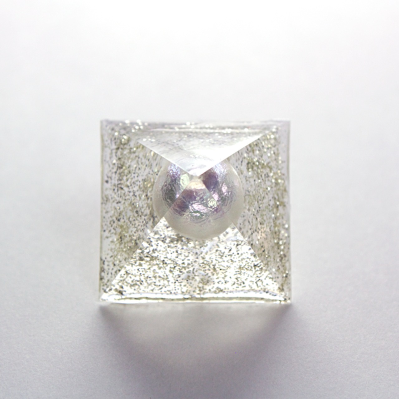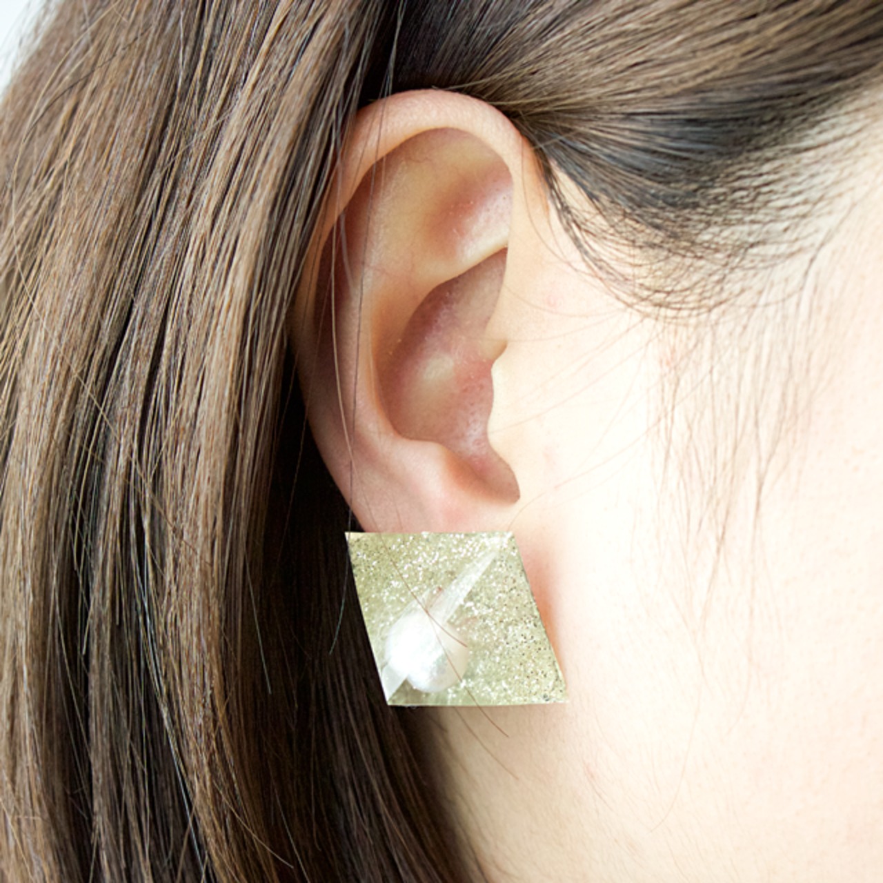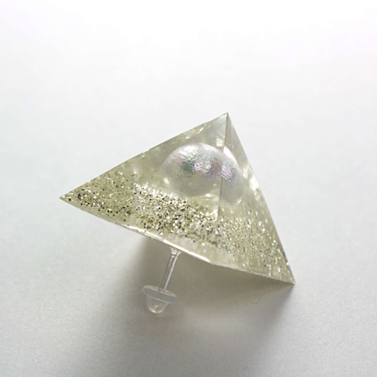 コットンパールをクリスタルレジンで閉じ込めたピラミッド型のピアスです。