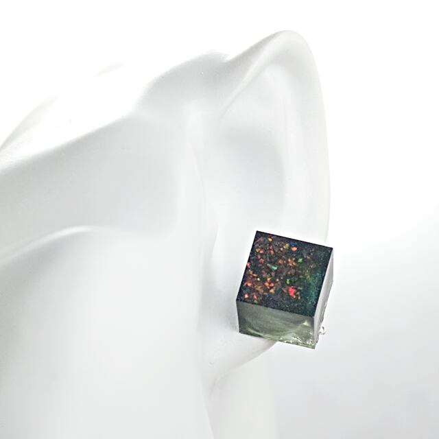 クラッシュ人工オパール、ラメ、ホワイトカラーなどをクリスタルレジンを用いて閉じ込めたキューブ型のイヤリングです。