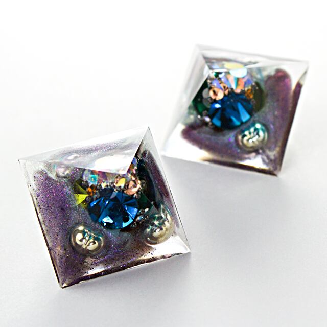 様々なビジューやパールストーン、ラメ、パープルカラーなどをクリスタルレジンで閉じ込めたピラミッド型のイヤリングです。