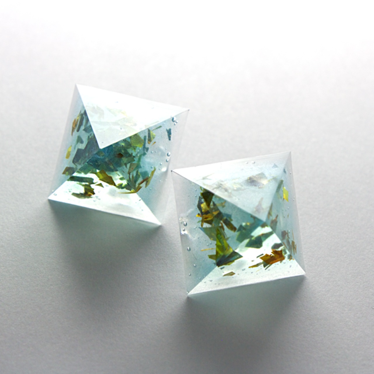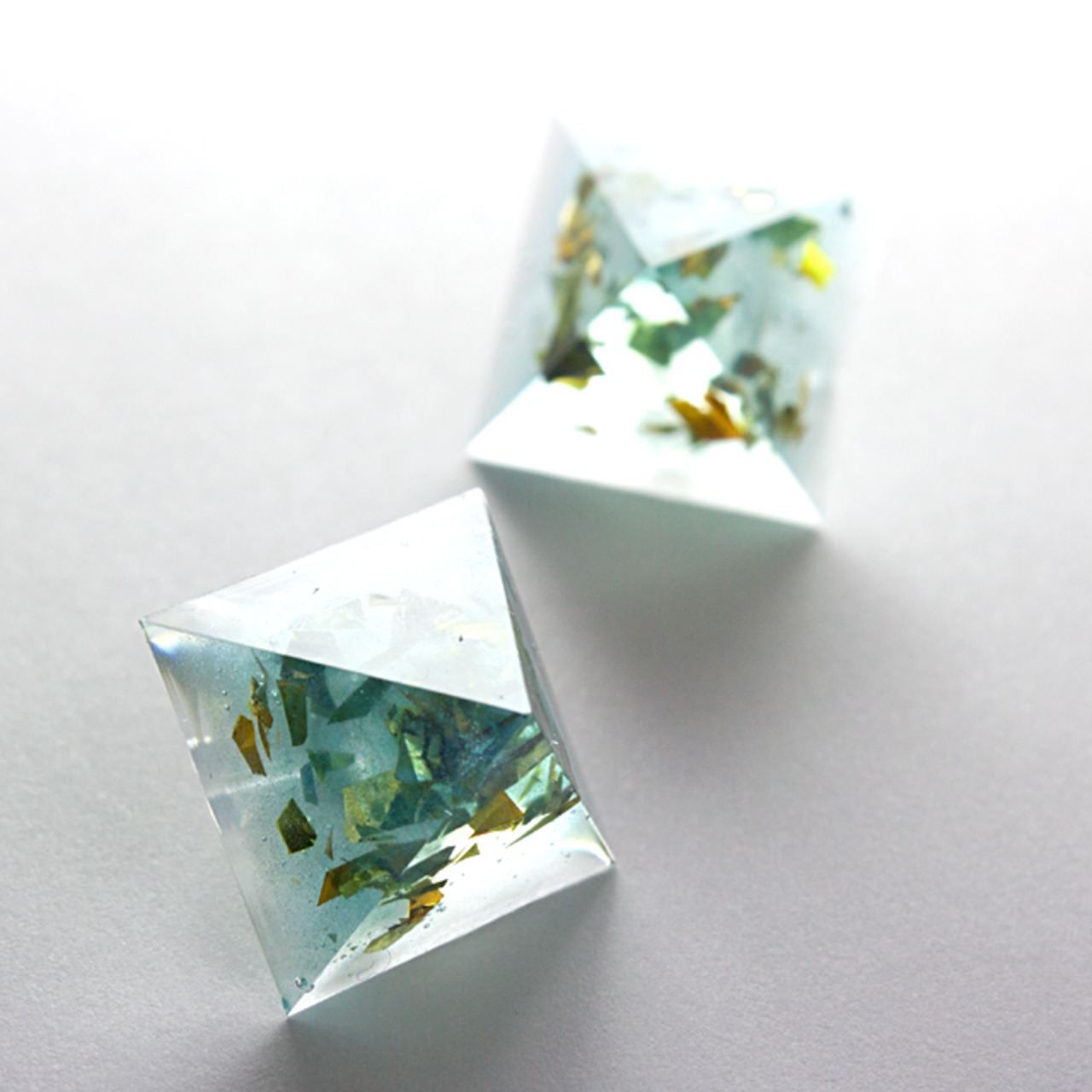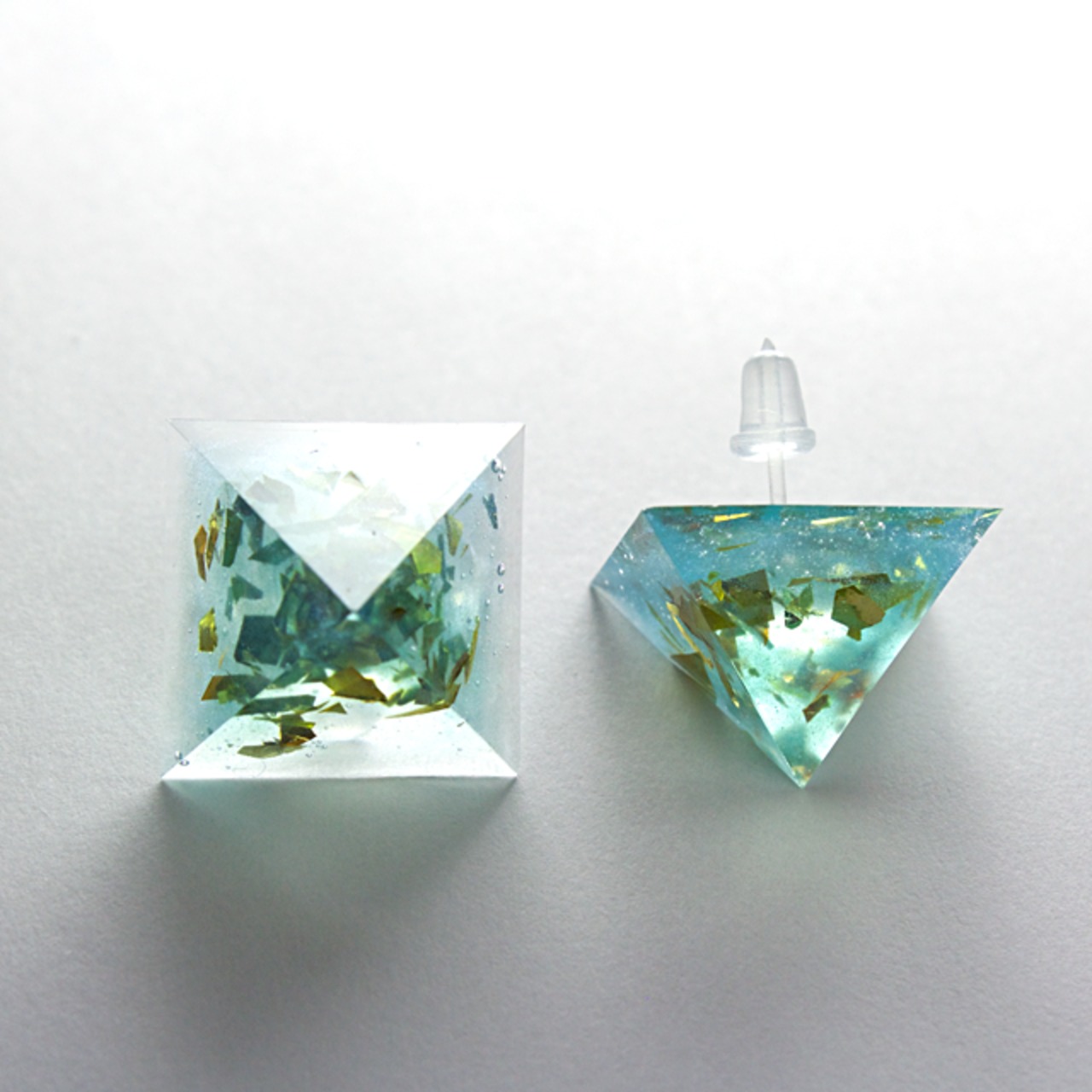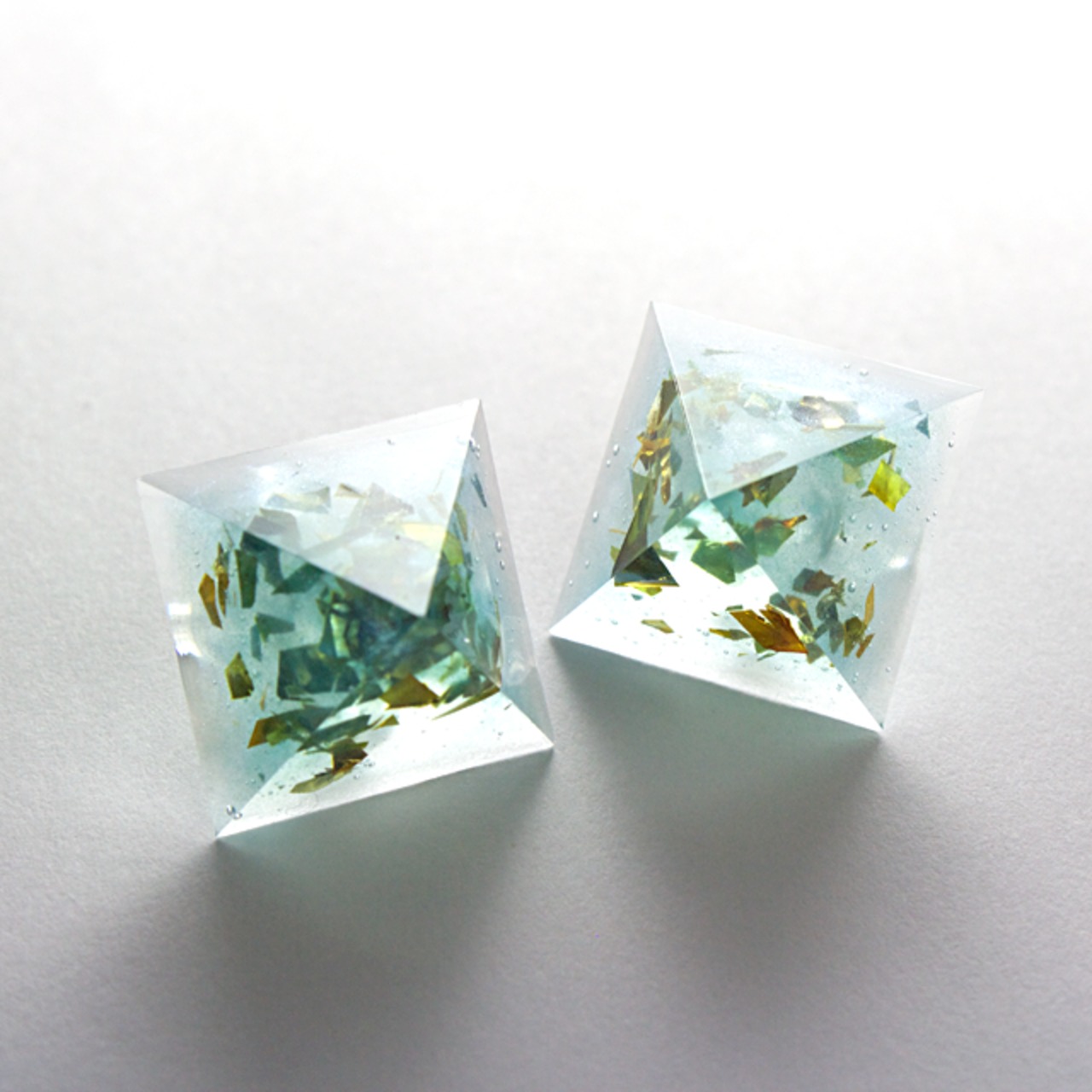パール系のカラーとゴールドを封じ込めたクリスタルレジンのピラミッド型のピアスです。