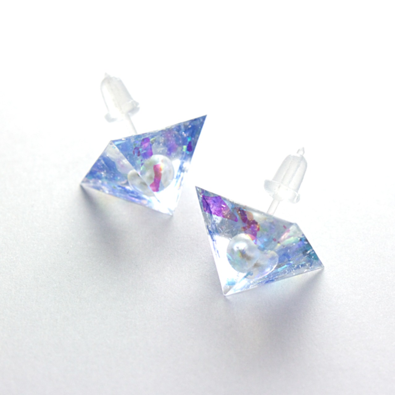 光り輝くオーロラにパールストーンをクリスタルレジンで閉じ込めたピラミッド型のピアスです。