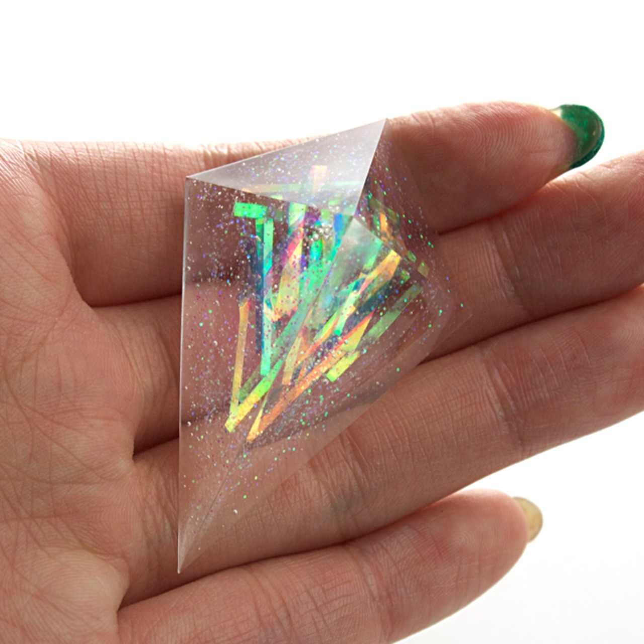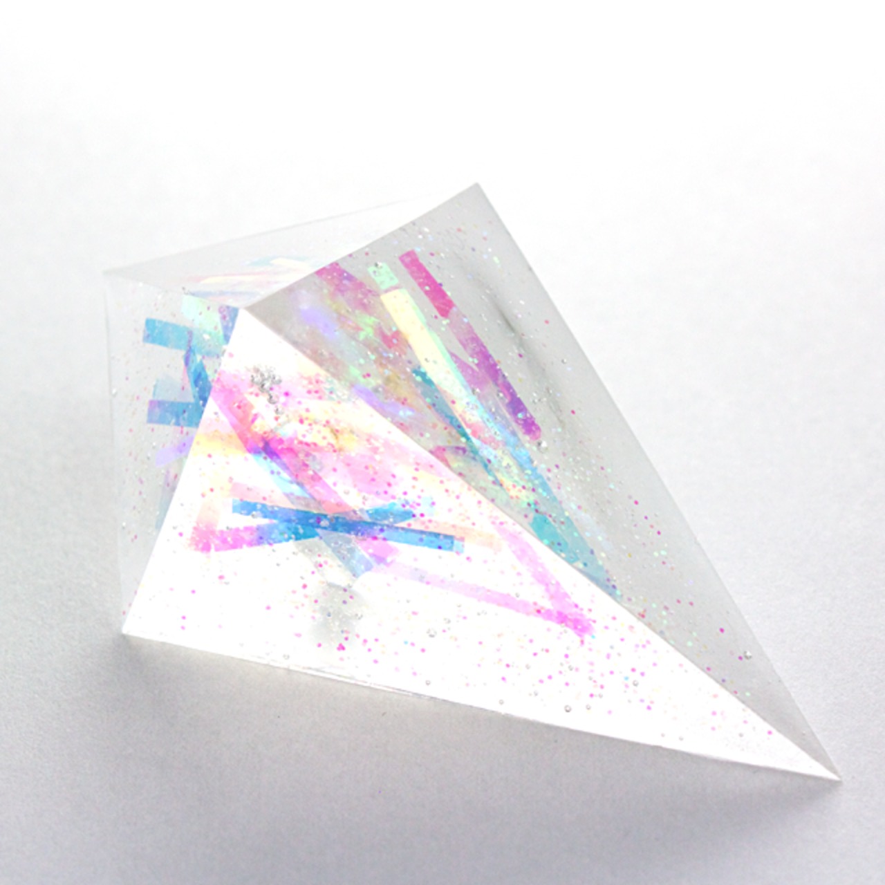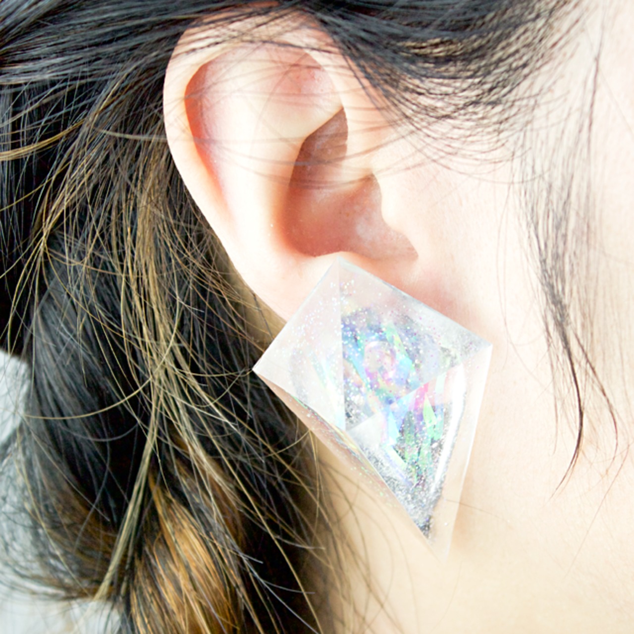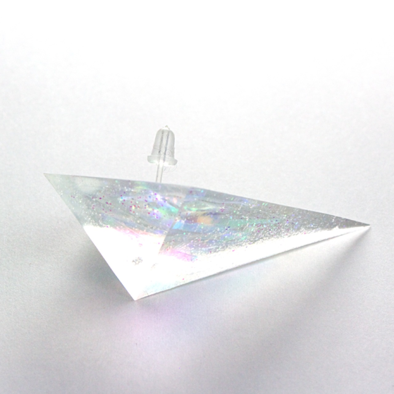 オーロラをクリスタルレジンで閉じ込めたピラミッド型のピアスです。