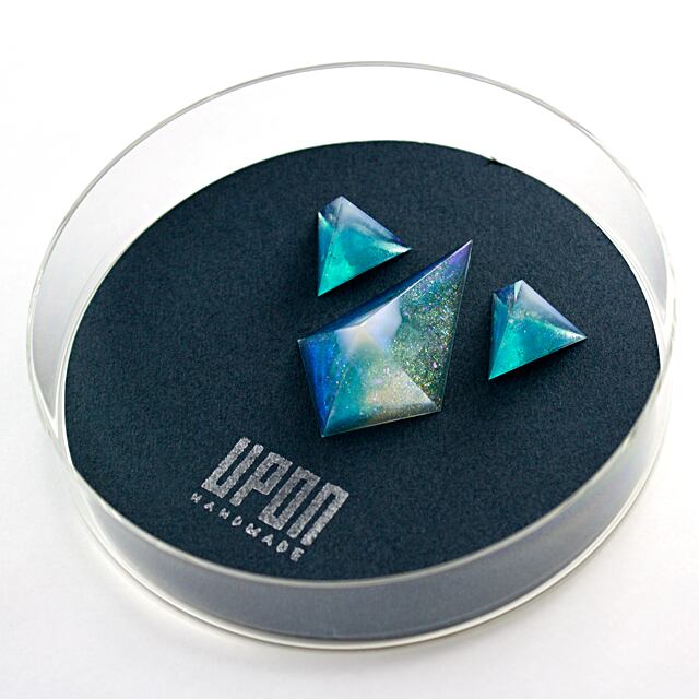 ブルー、ホワイトカラー、ゴールドや偏光のパウダーなどをクリスタルレジンで閉じ込めたジェムストーンです。