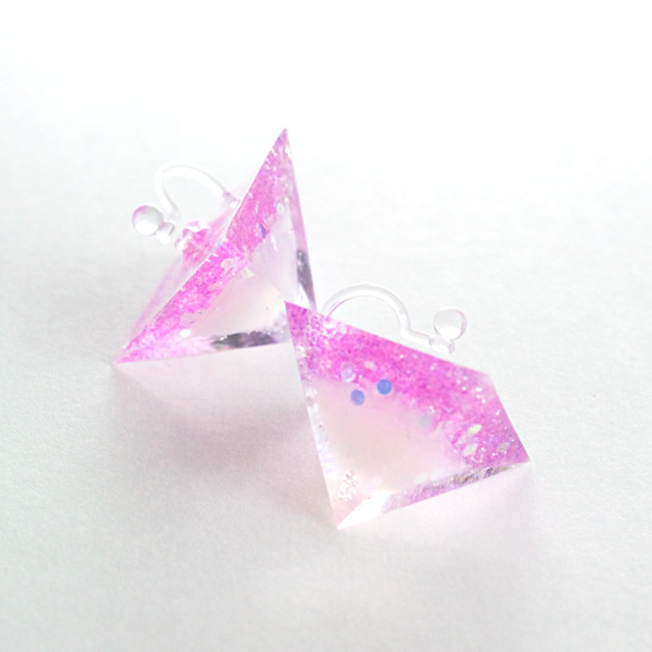 ホワイトカラーと丸ラメピンクをクリスタルレジンで閉じ込めたピラミッド型のノンホールピアスです。