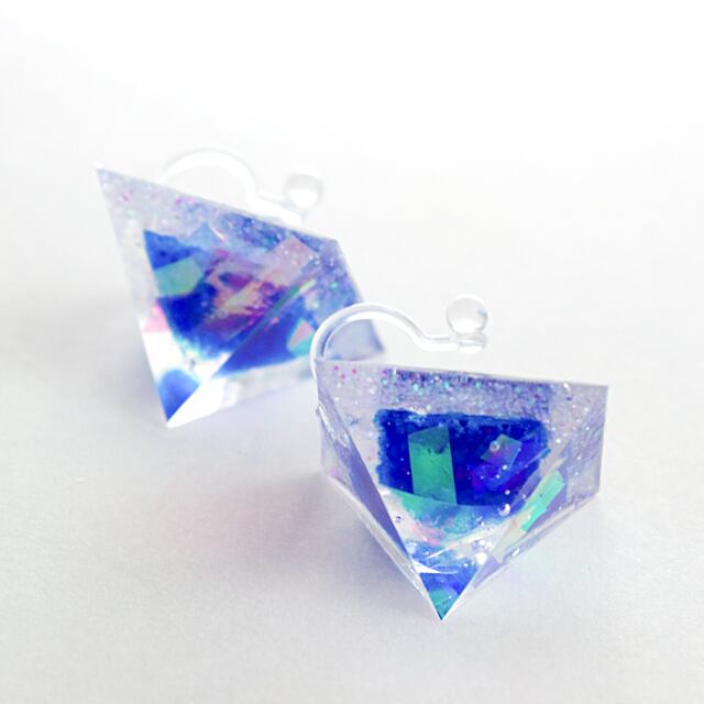 オーロラとブルーと細かなラメをクリスタルレジンで閉じ込めたピラミッド型のノンホールピアスです。
