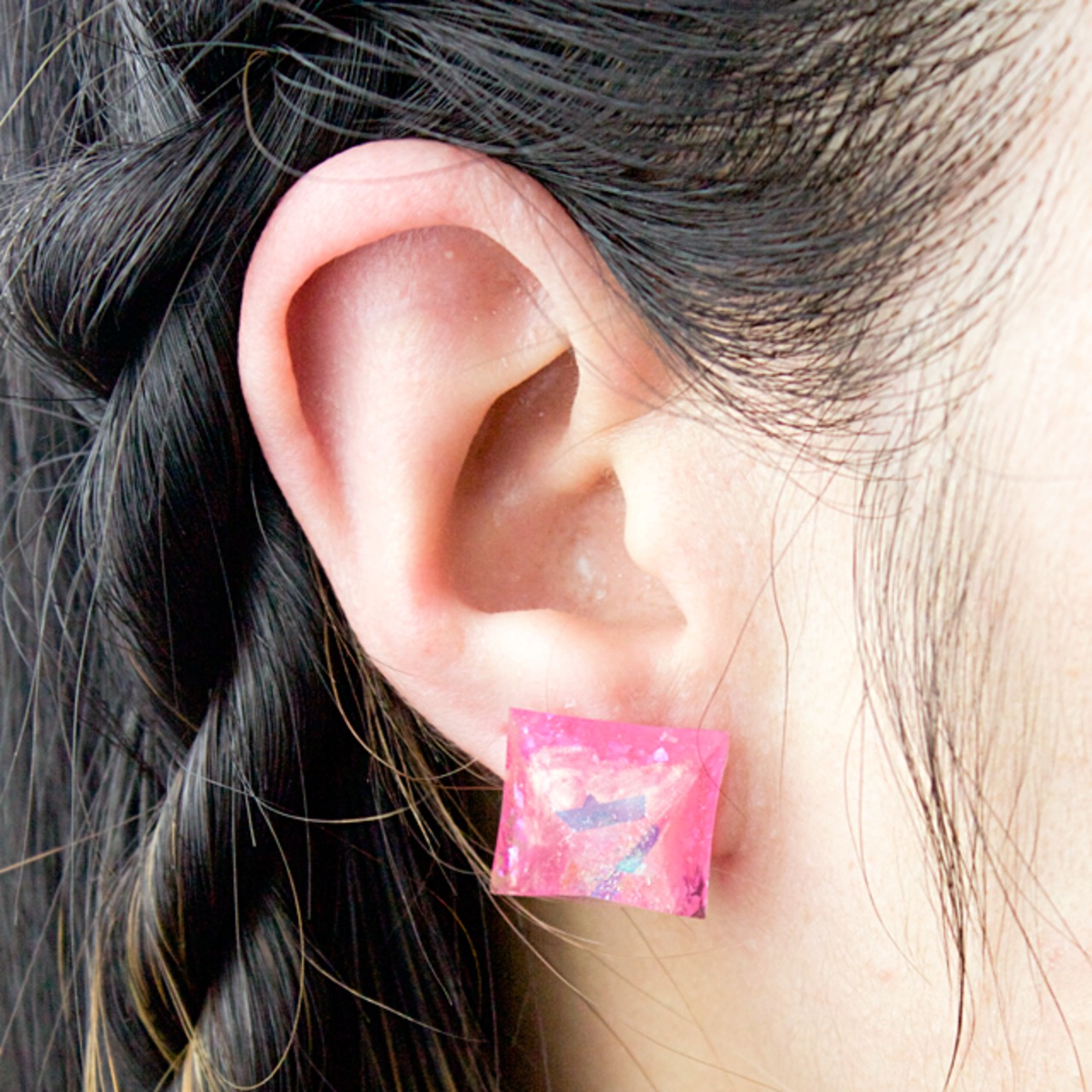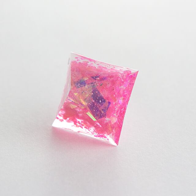 濃いめのピンクカラー、乱切りオーロラペーパーなどを絶妙に配合しクリスタルレジンで閉じ込めたピラミッド型のピアスです。
