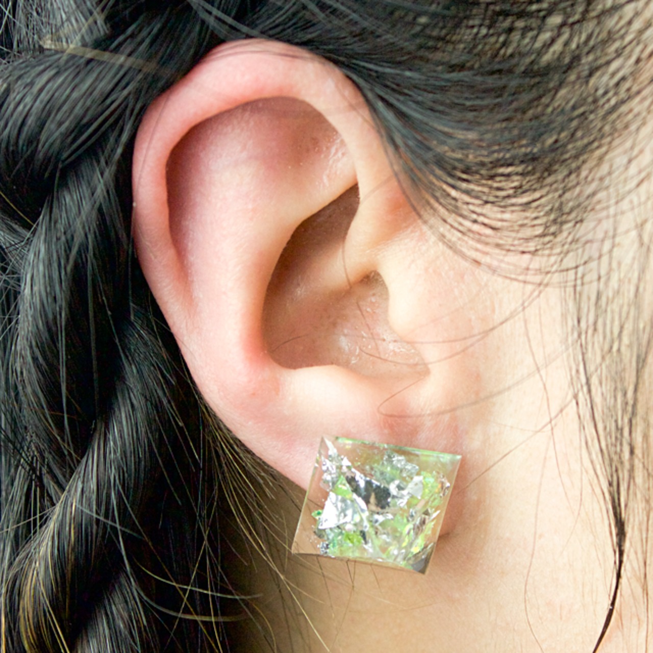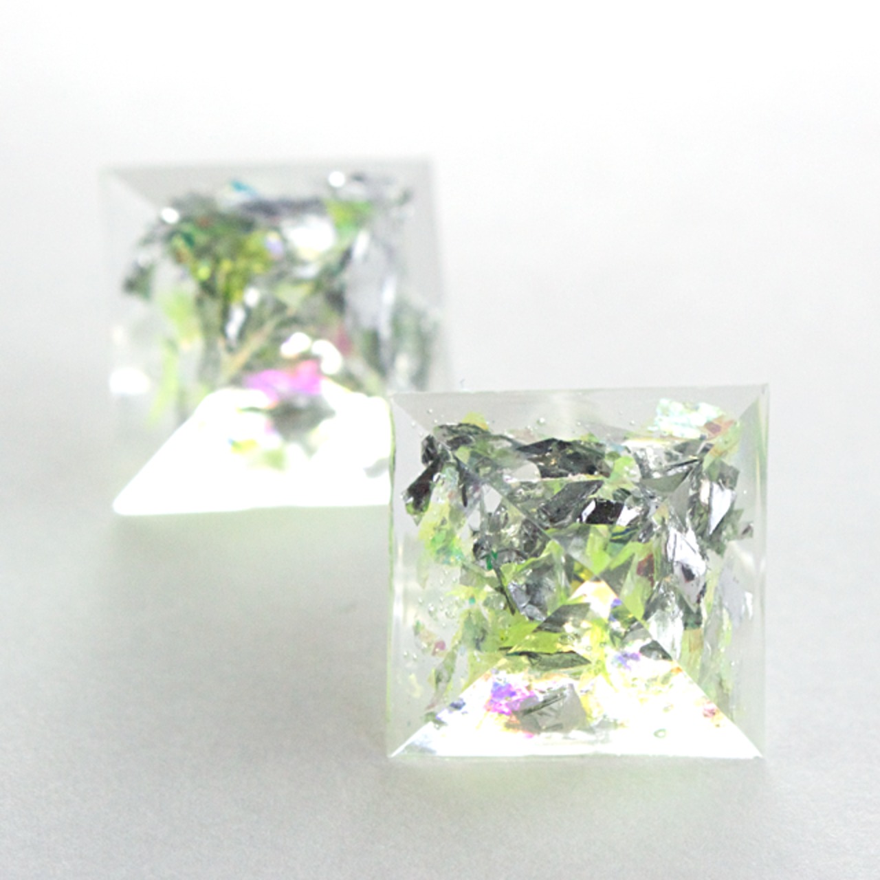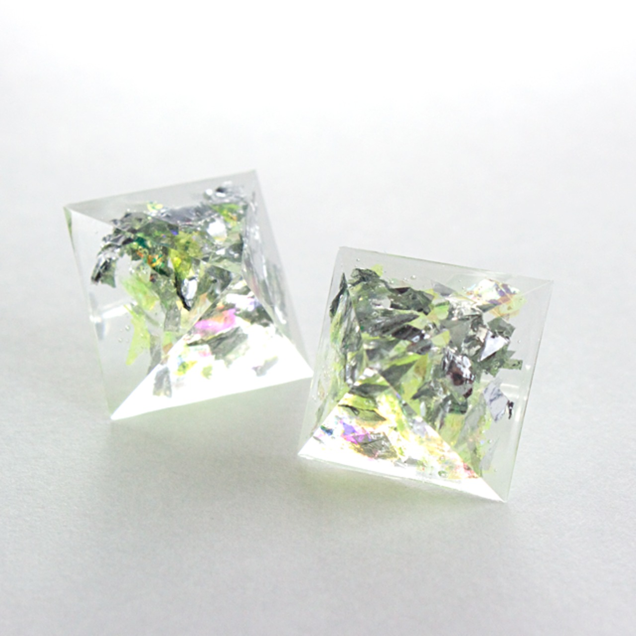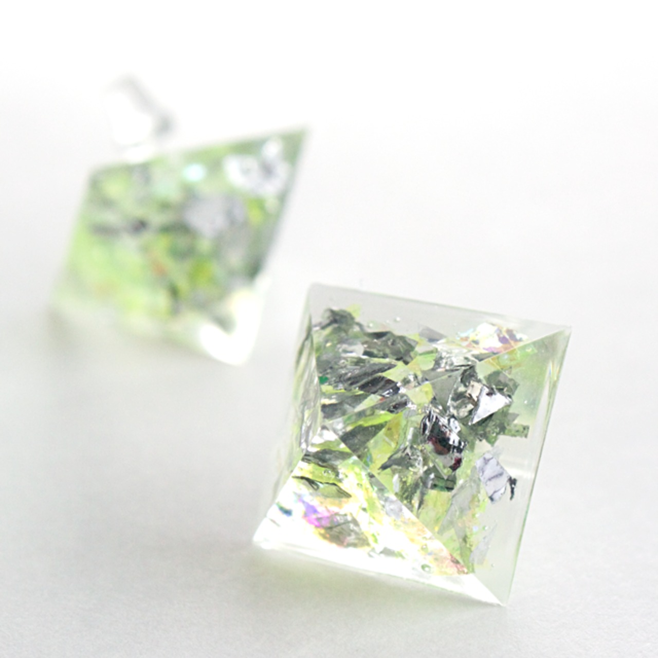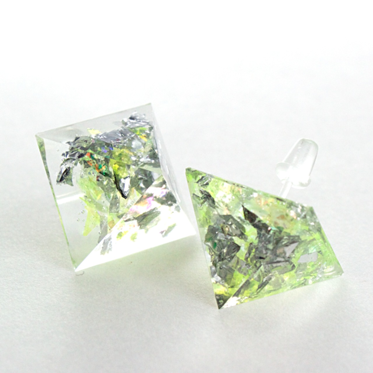 黄緑にシルバーとオーロラなどを絶妙な配合でクリスタルレジンで閉じ込めたピラミッド型のピアスです。
