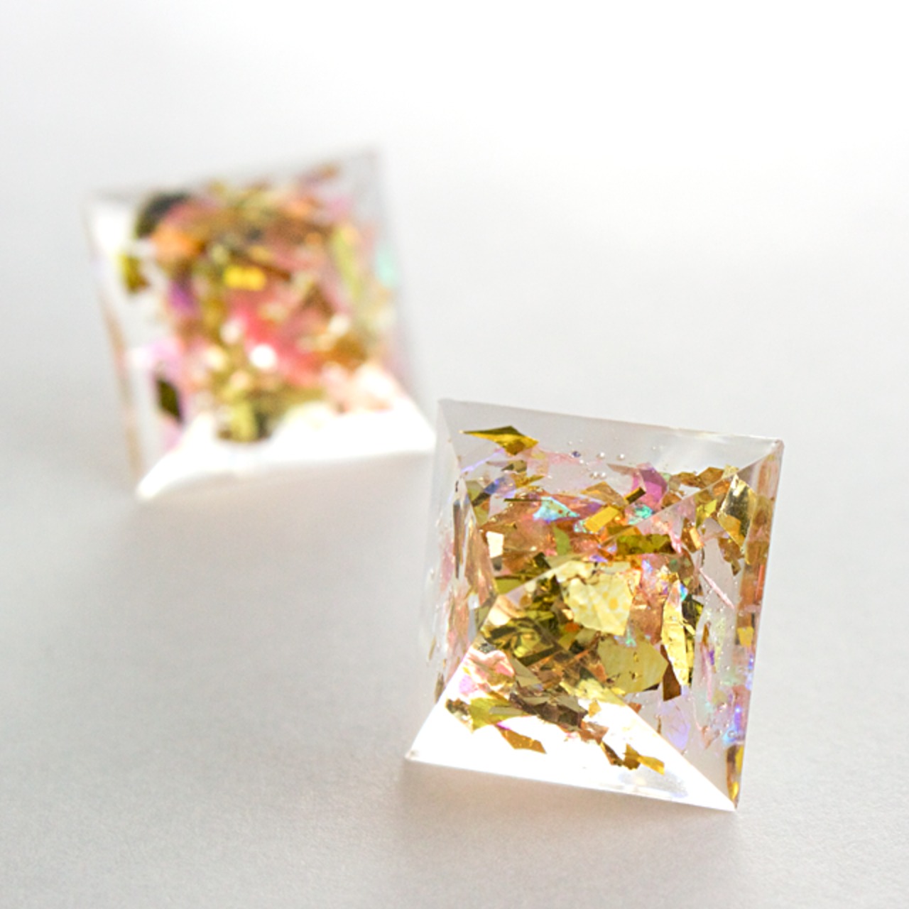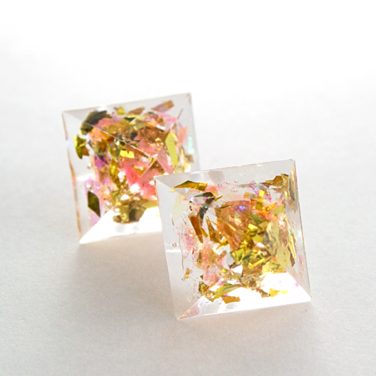 薄いピンクにゴールドのラメなどをクリスタルレジンで閉じ込めたピラミッド型のピアスです。