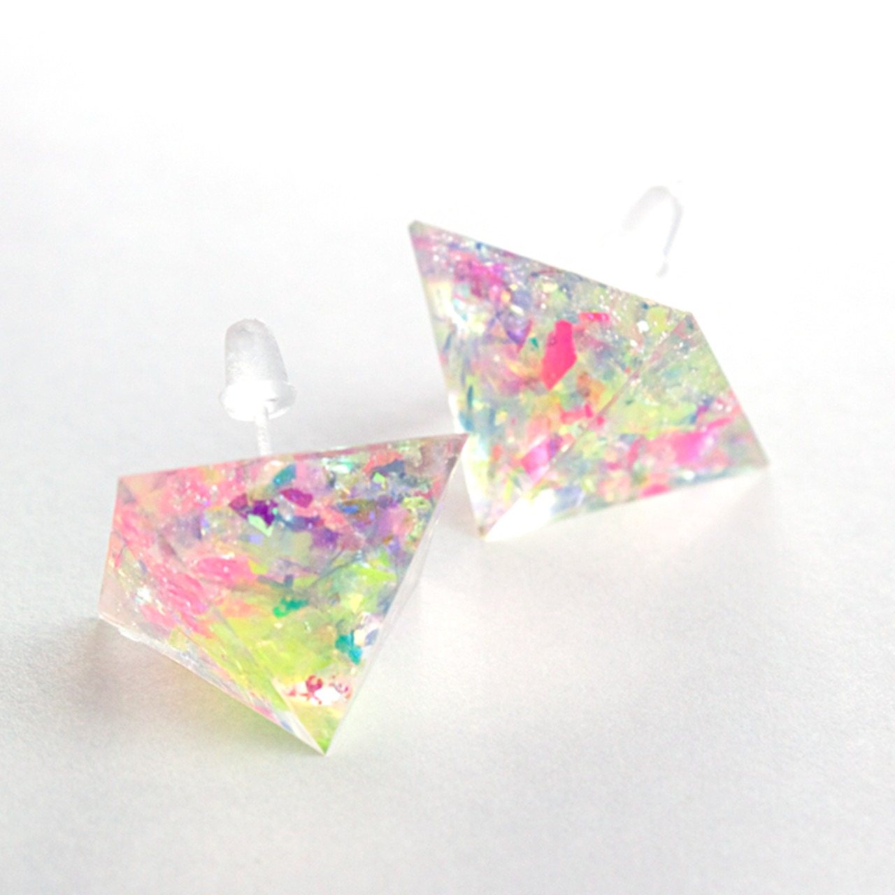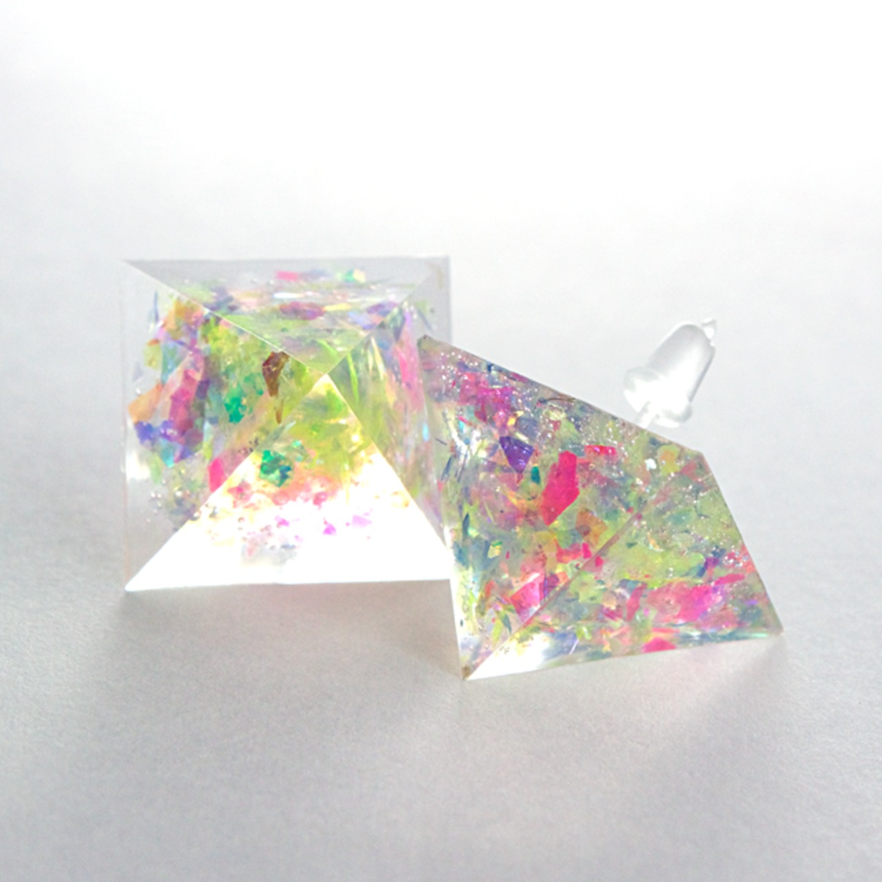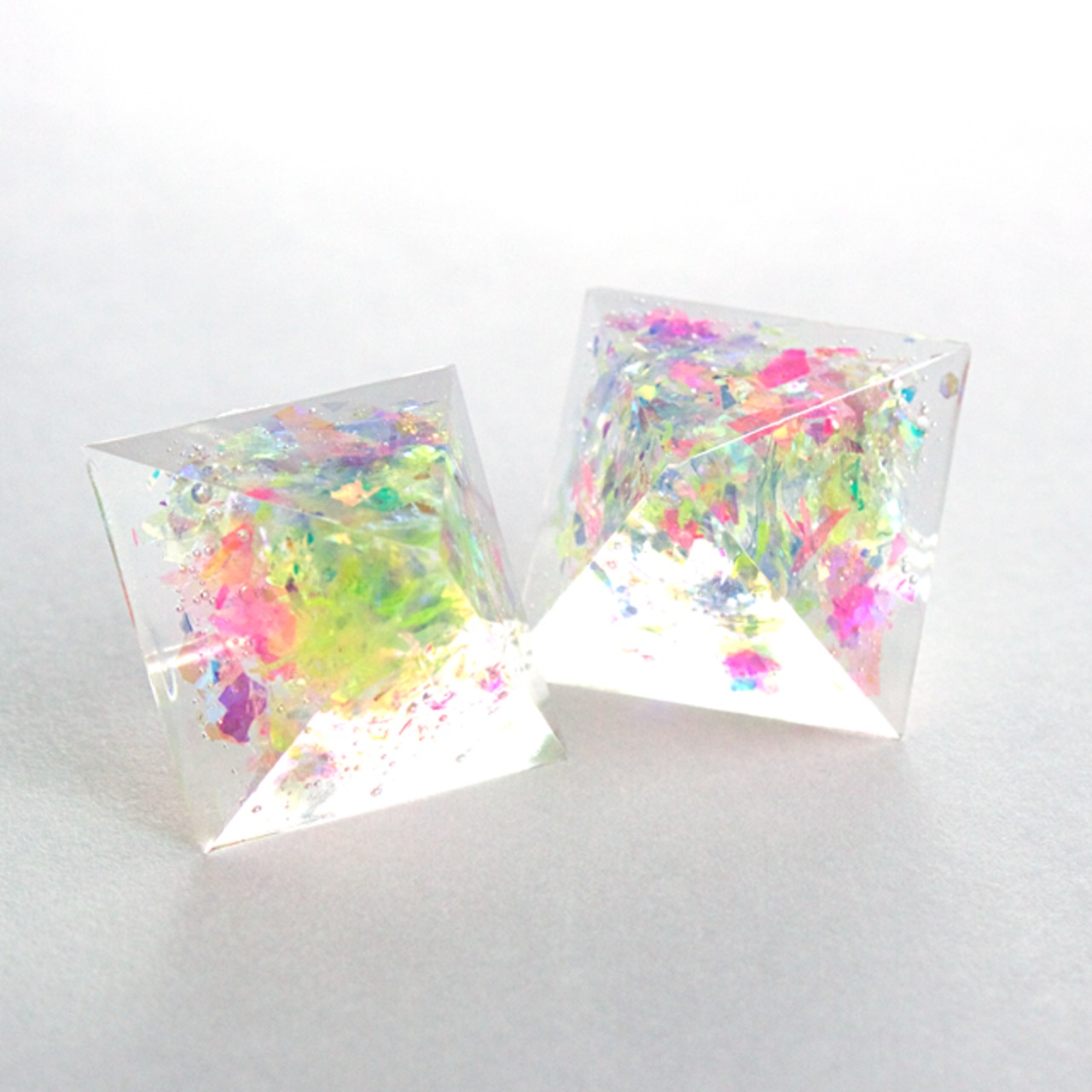 三色のホログラムラメをたっぷりクリスタルレジンで閉じ込めたピラミッド型のピアスです。