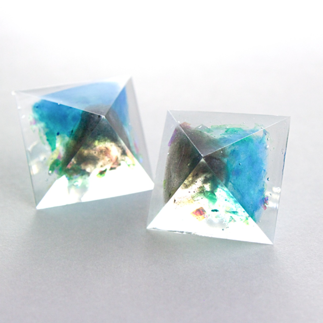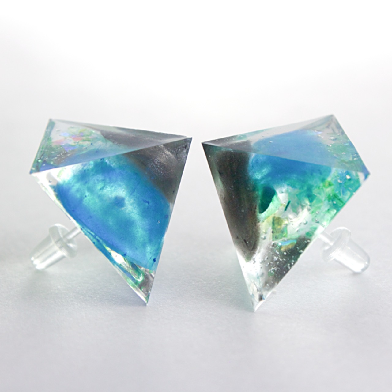 ブルーとブラック、ホログラムラメをクリスタルレジンで閉じ込めたピラミッド型のピアスです。