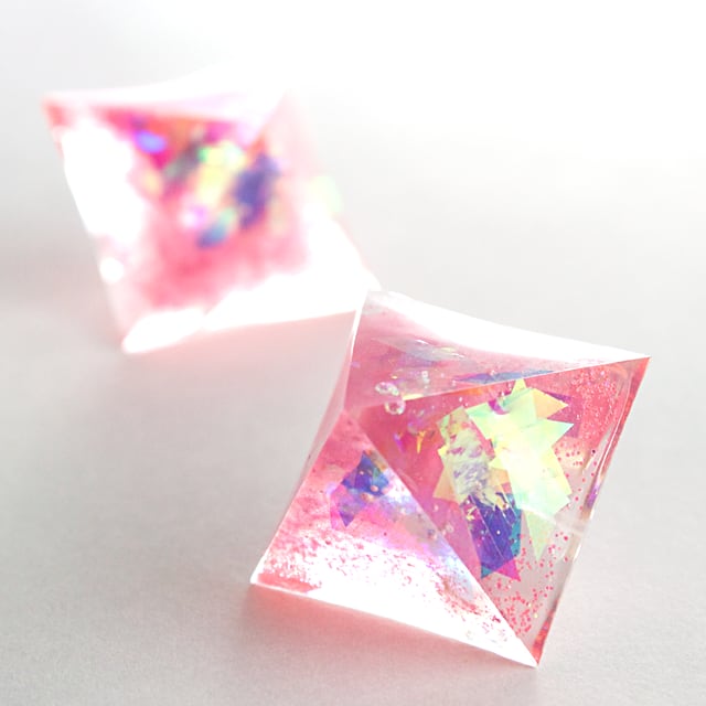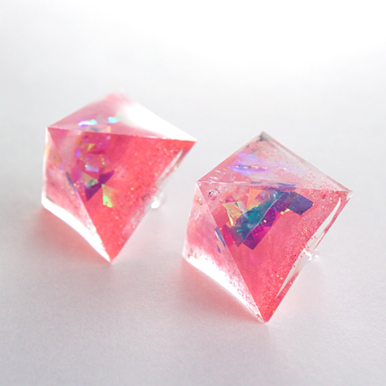 ピンク系のカラーとオーロラをクリスタルレジンで閉じ込めたピラミッド型のピアスです。