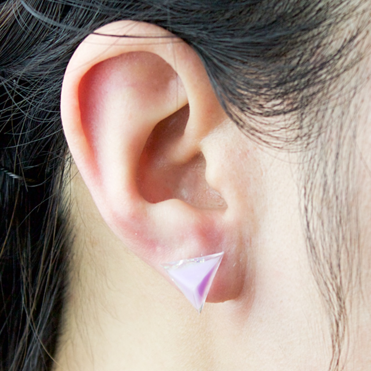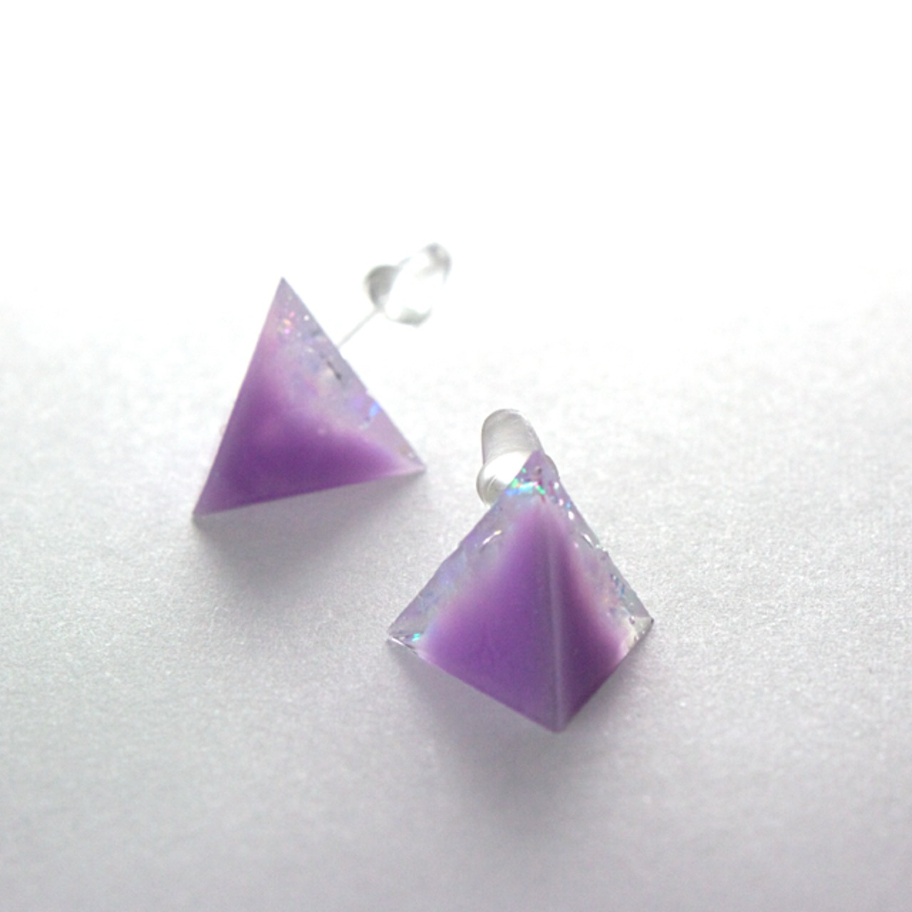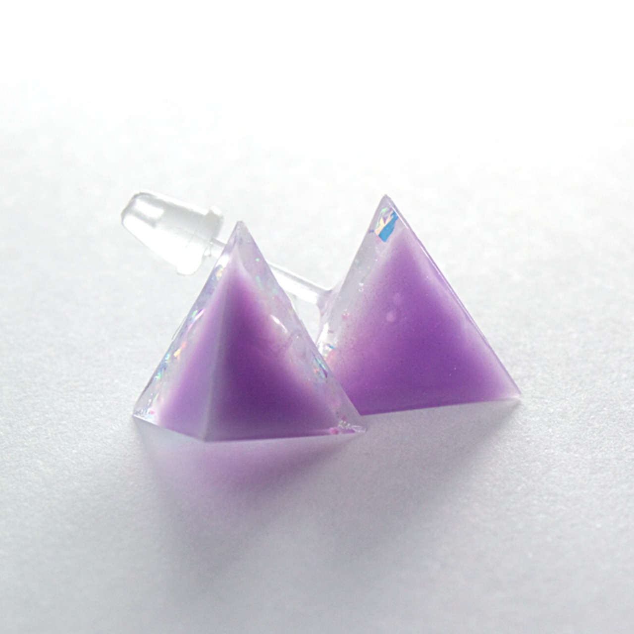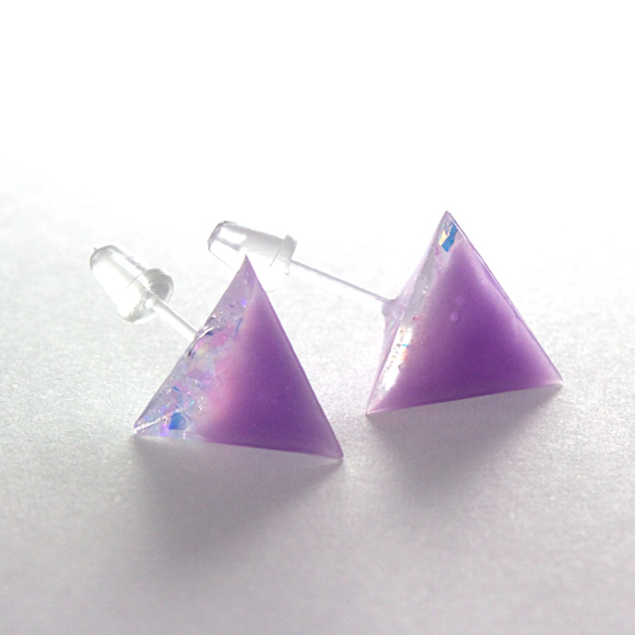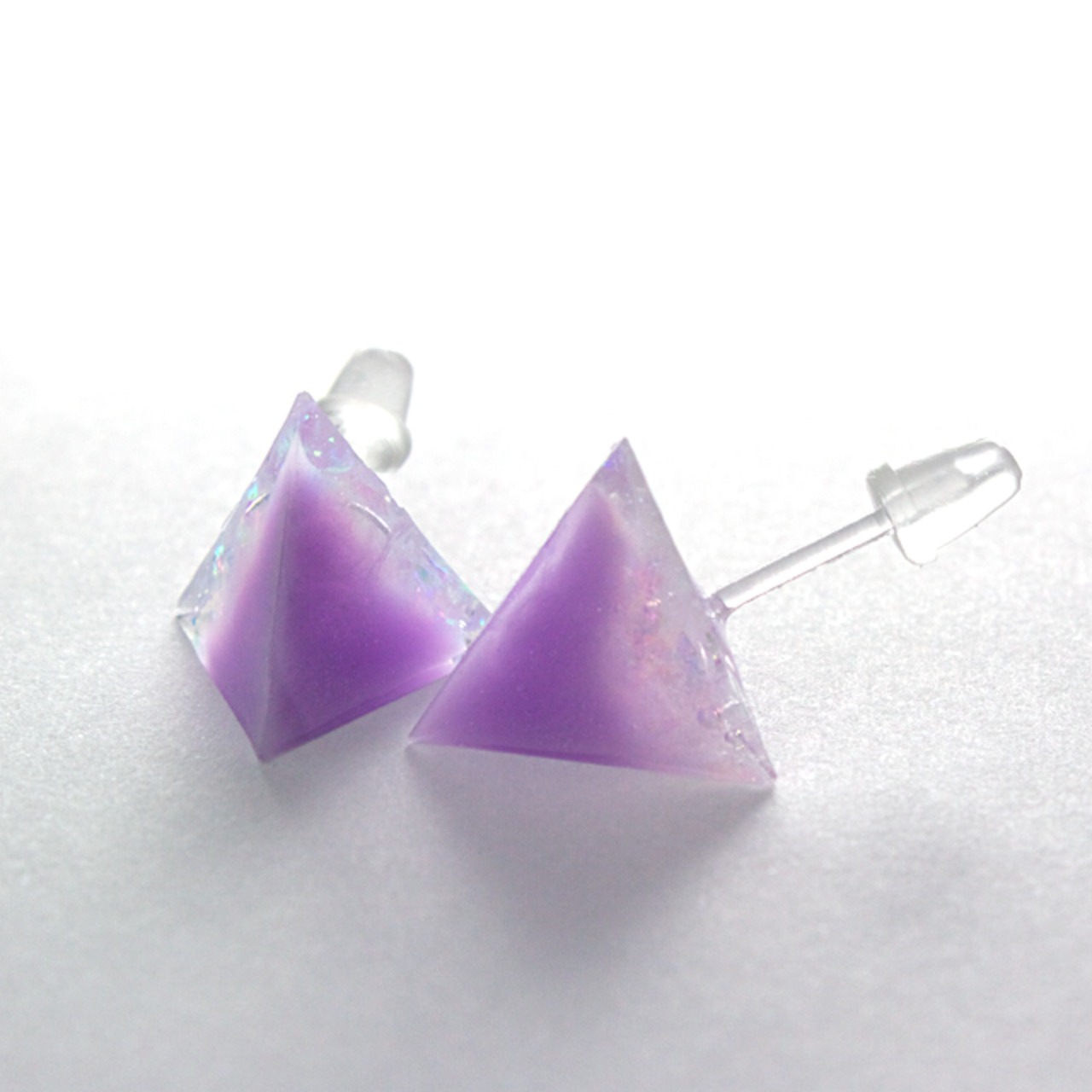 ペールカラーのパープルとオーロラをクリスタルレジンで閉じ込めた三角錐型のピアスです。