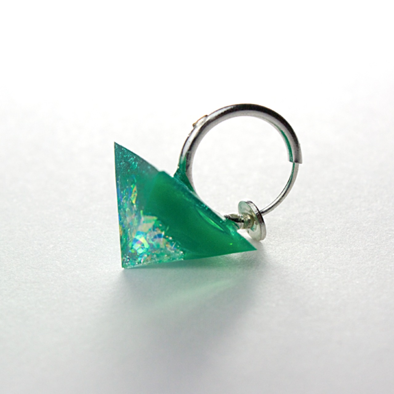 濃いめのグリーンとオーロラをクリスタルレジンで閉じ込めたピラミッド型のイヤリングです。