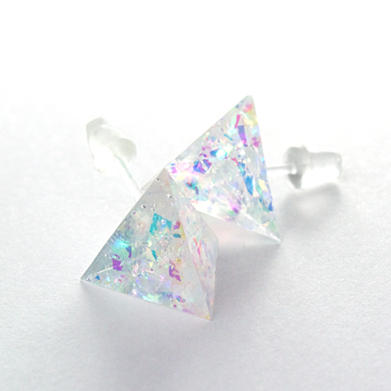 細かく刻んだオーロラをクリスタルレジンで閉じ込めた三角錐型のピアスです。