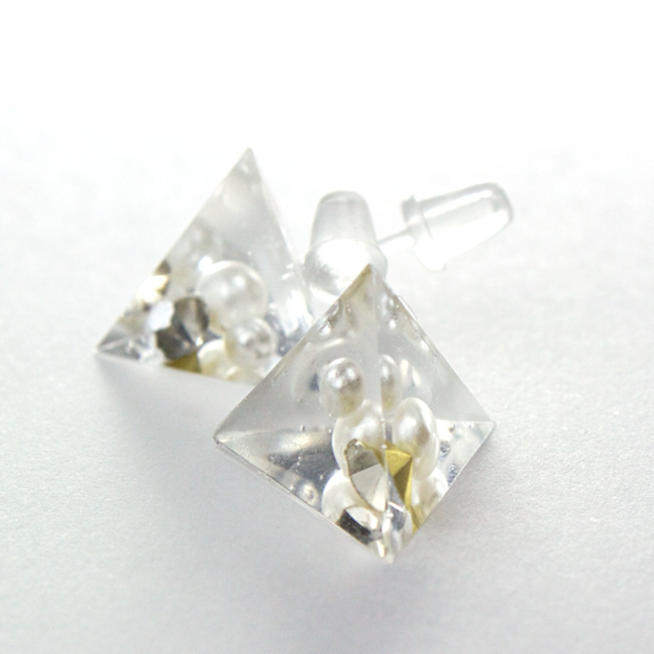 パールストーンとビジューをクリスタルレジンで閉じ込めた三角錐型のピアスです。