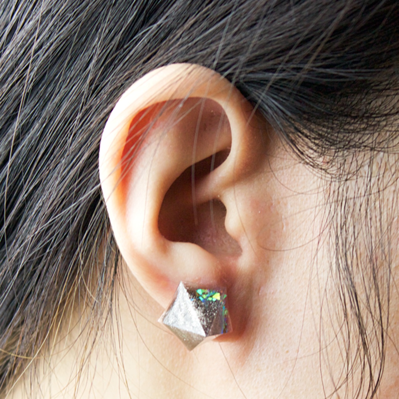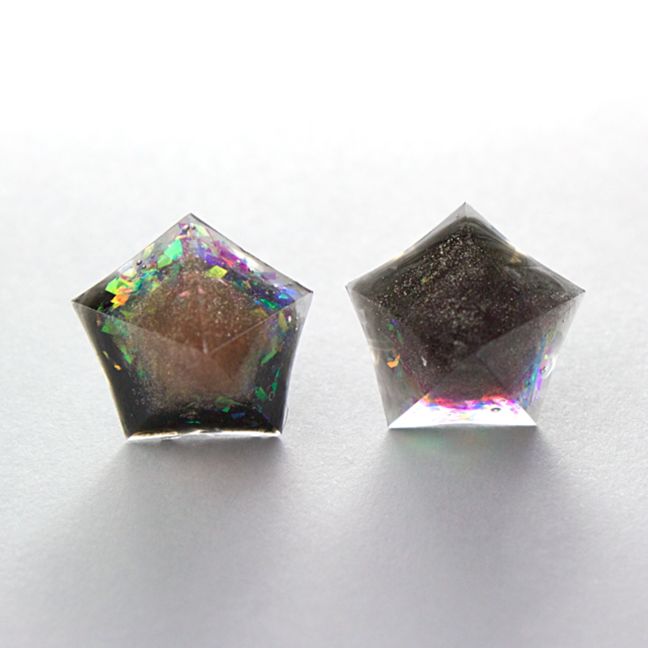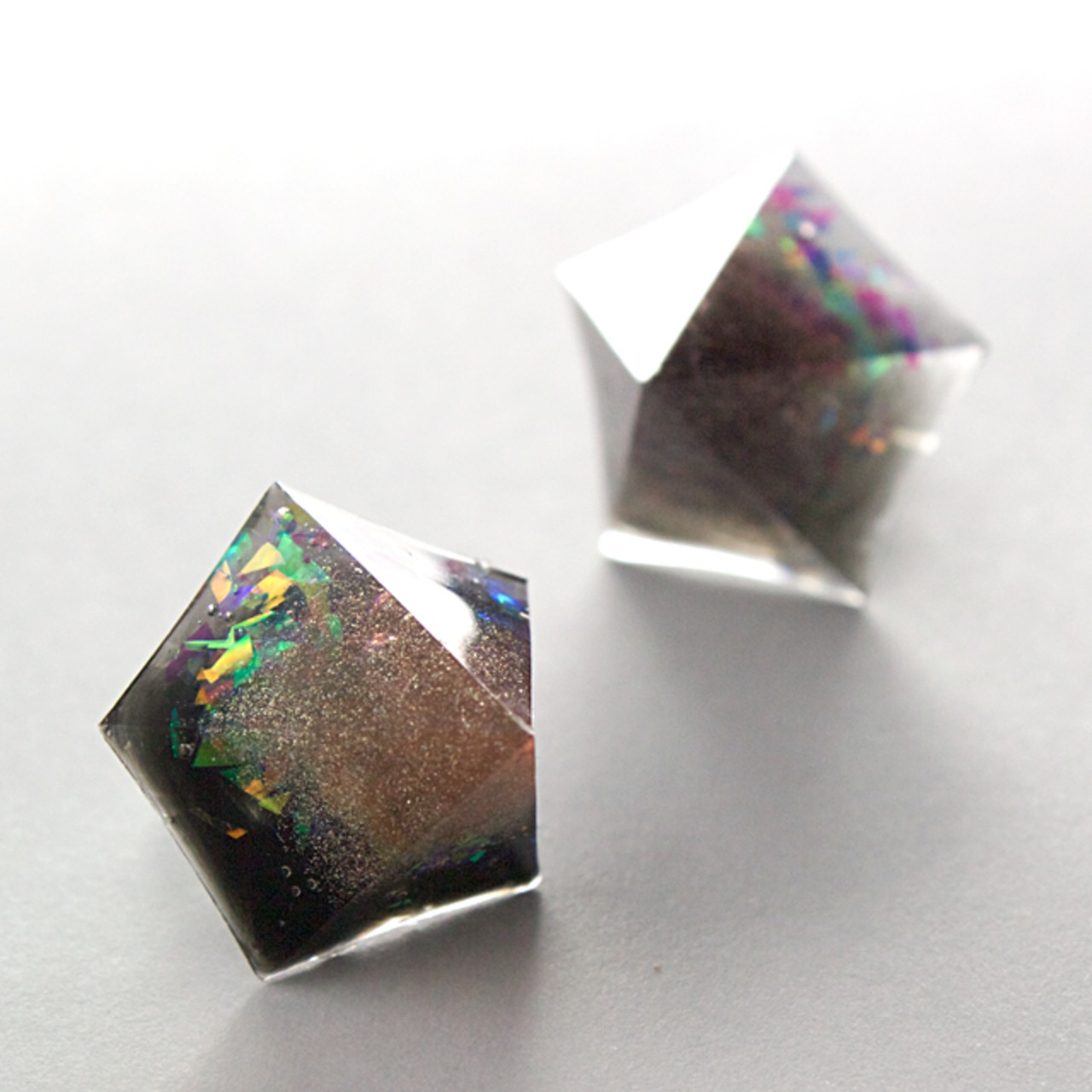 ブラックとオーロラをクリスタルレジンで閉じ込めたペンタゴン型のピアスです。