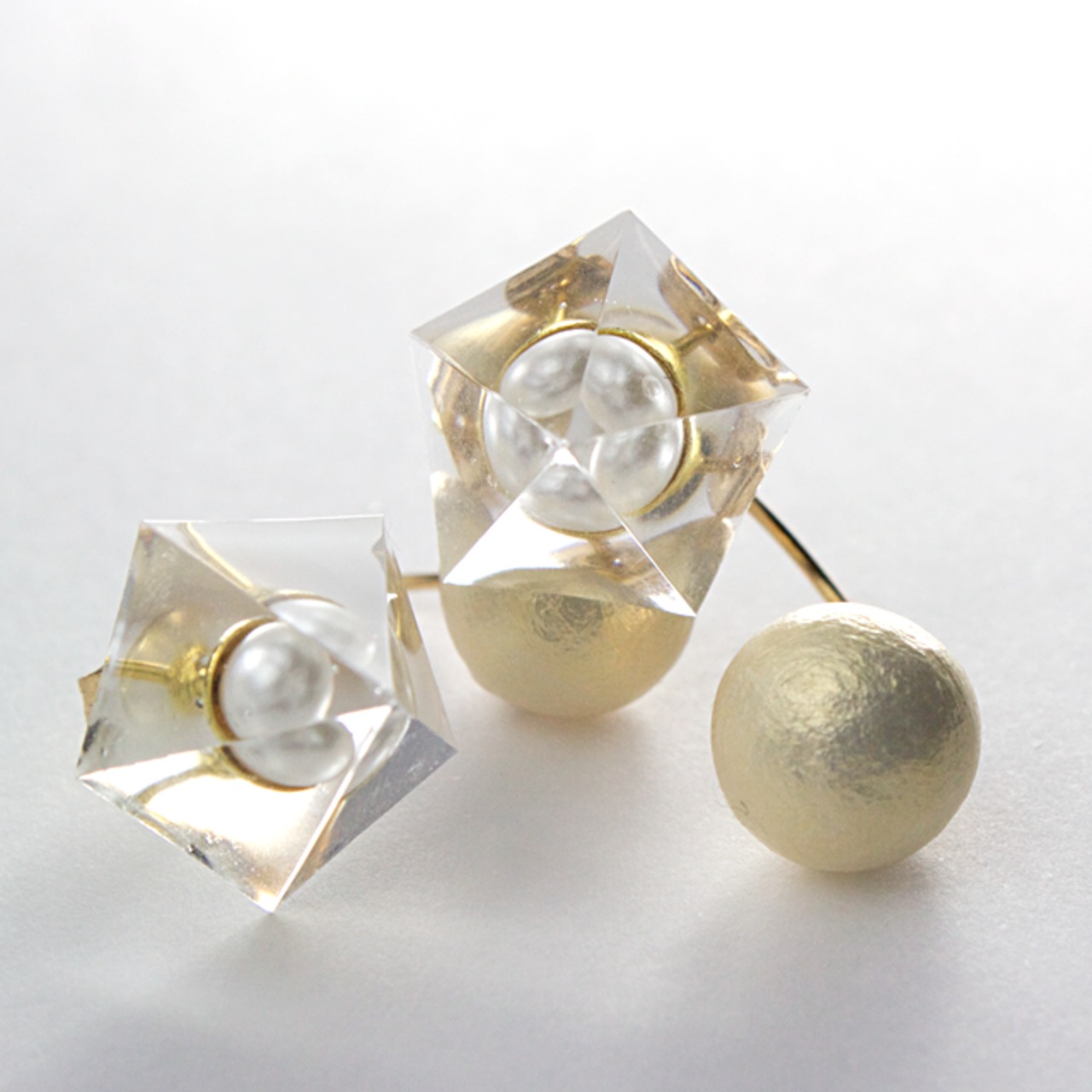 パールストーンをクリスタルレジンで閉じ込めたペンタゴン型のピアスです。