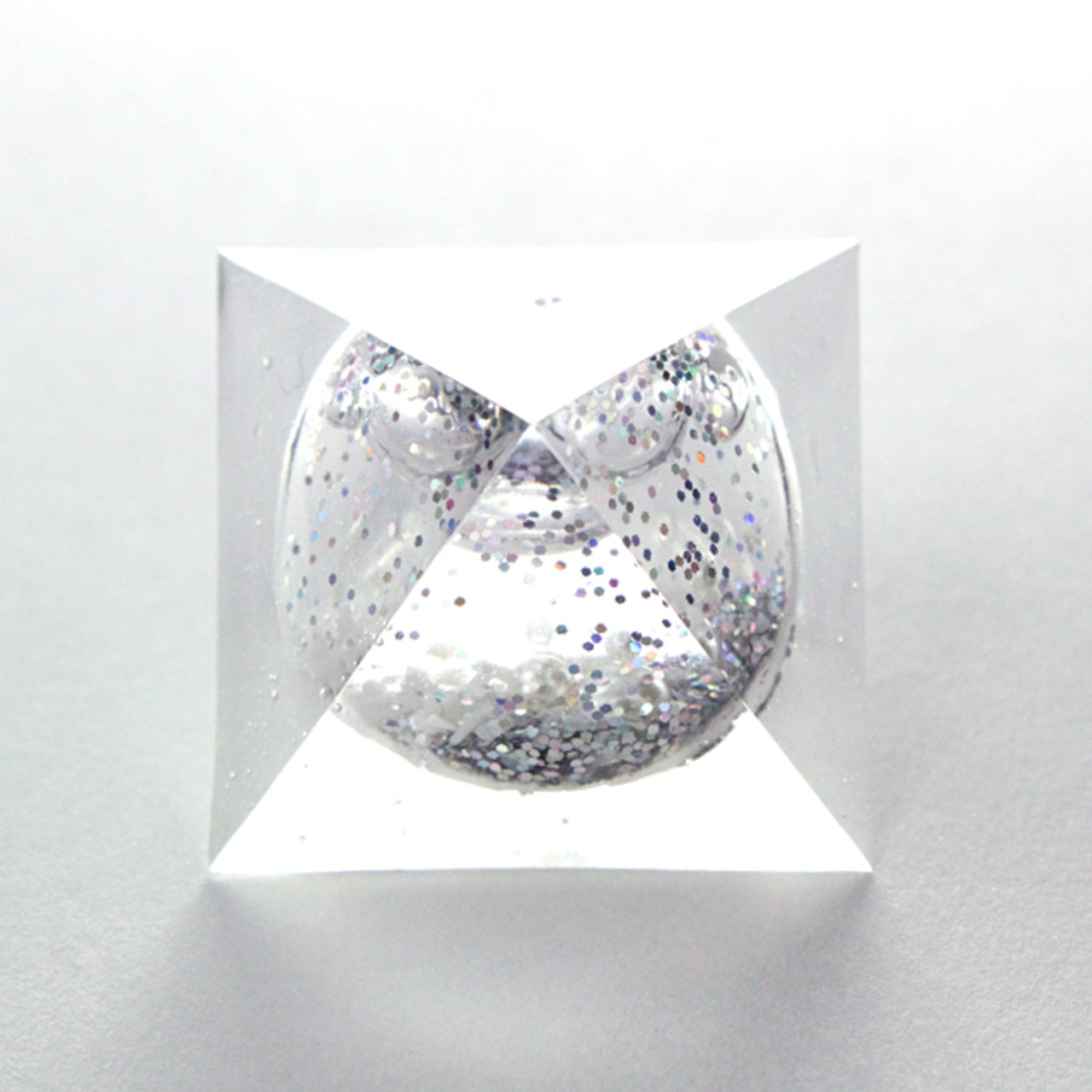 通常のピラミッドピアスの中を空洞にし、そこに水とラメやパールストーンとVカットストーンをクリスタルレジンで閉じ込めたピラミッド型のピアスです。振るとラメが水中でゆっくりと浮遊し、金属玉がシャラシャラと音を奏でます。