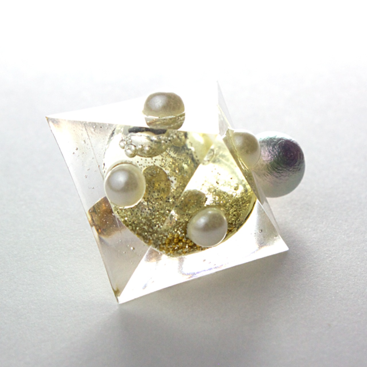 通常のピラミッドピアスの中を空洞にし、そこに水とゴールドのラメとゴールドの金属玉の間からVカットストーンが見え隠れするピラミッド型のピアスです。振るとラメが水中でゆっくりと浮遊し、金属玉がシャラシャラと音を奏でます。