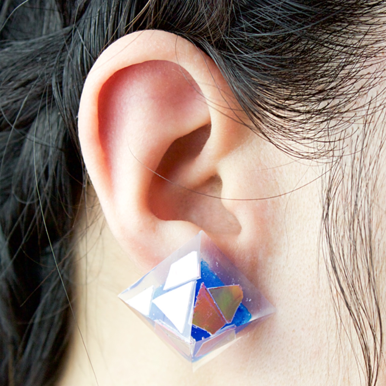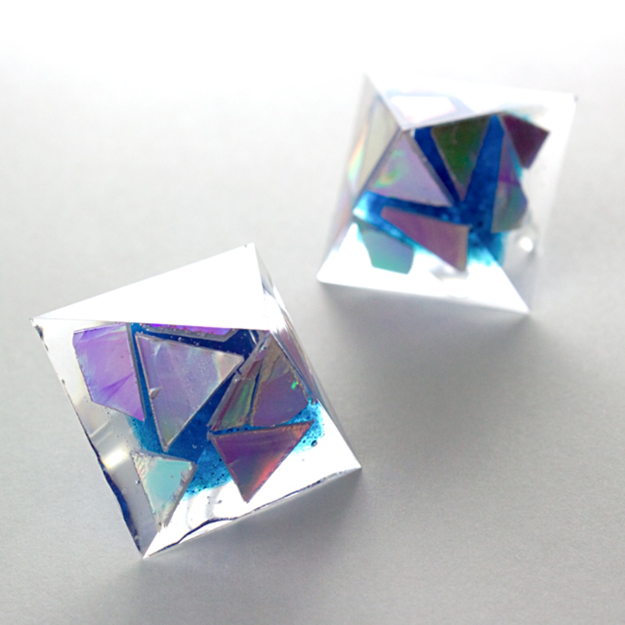 DVDの破片とブルーをクリスタルレジンで閉じ込めたピラミッドピアスです。