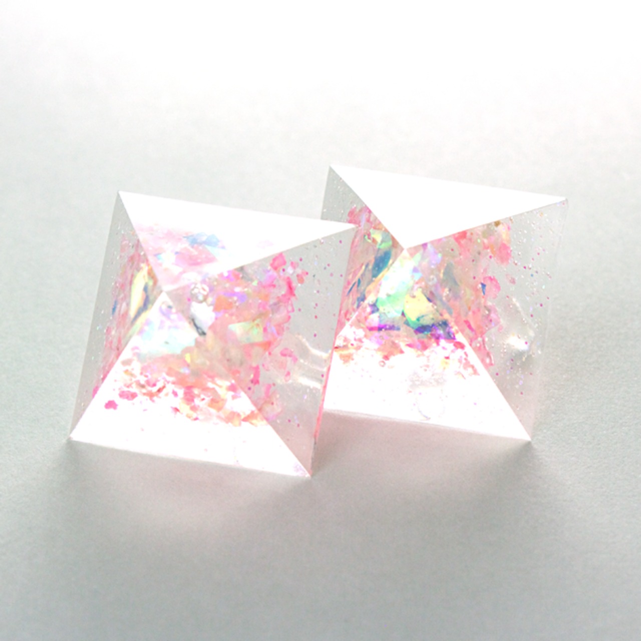 ピンク系のカラーをクリスタルレジンで閉じ込めたピラミッドピアスです。