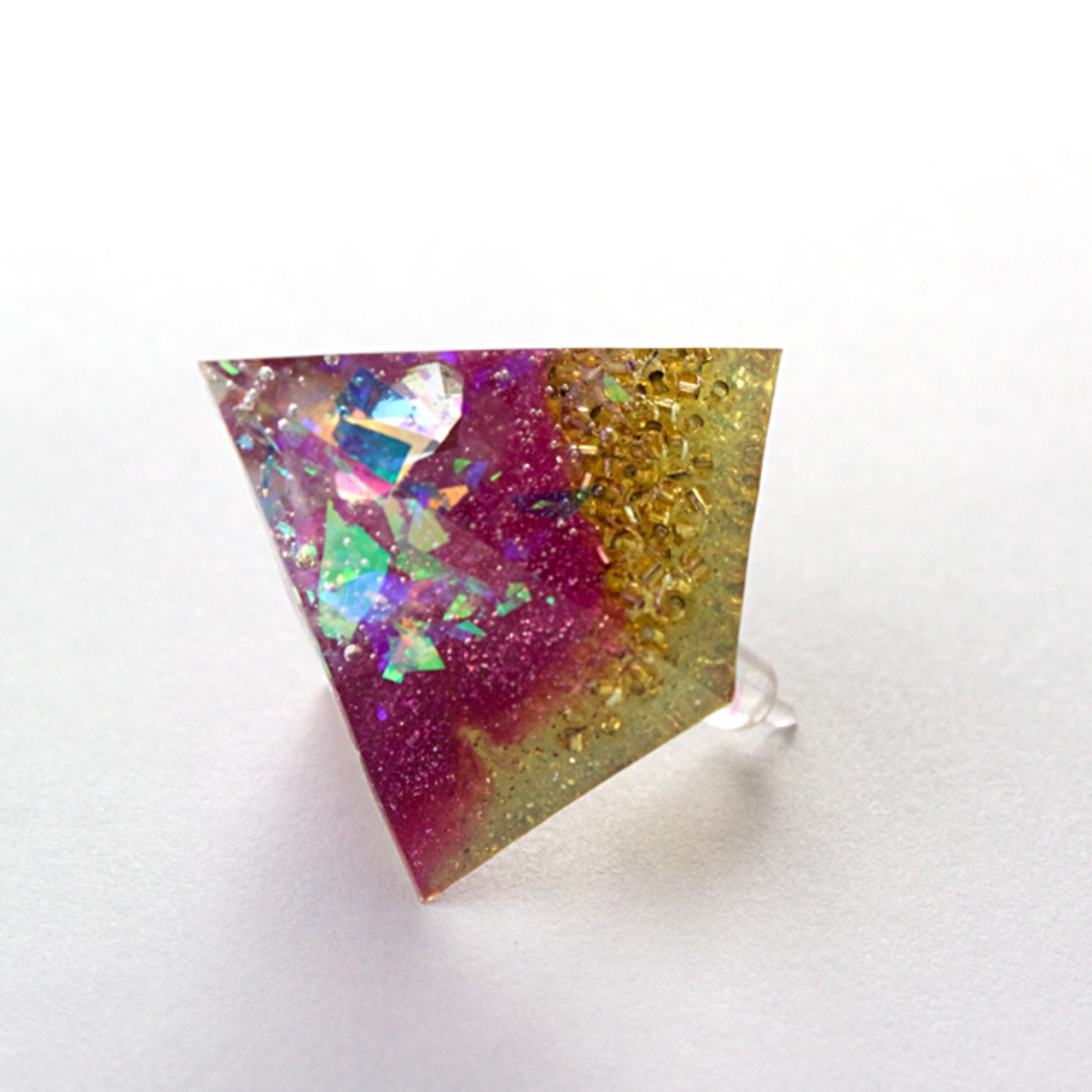 オーロラと赤、イエローなどをクリスタルレジンで閉じ込めたペンタゴンピアス型のピアスです。