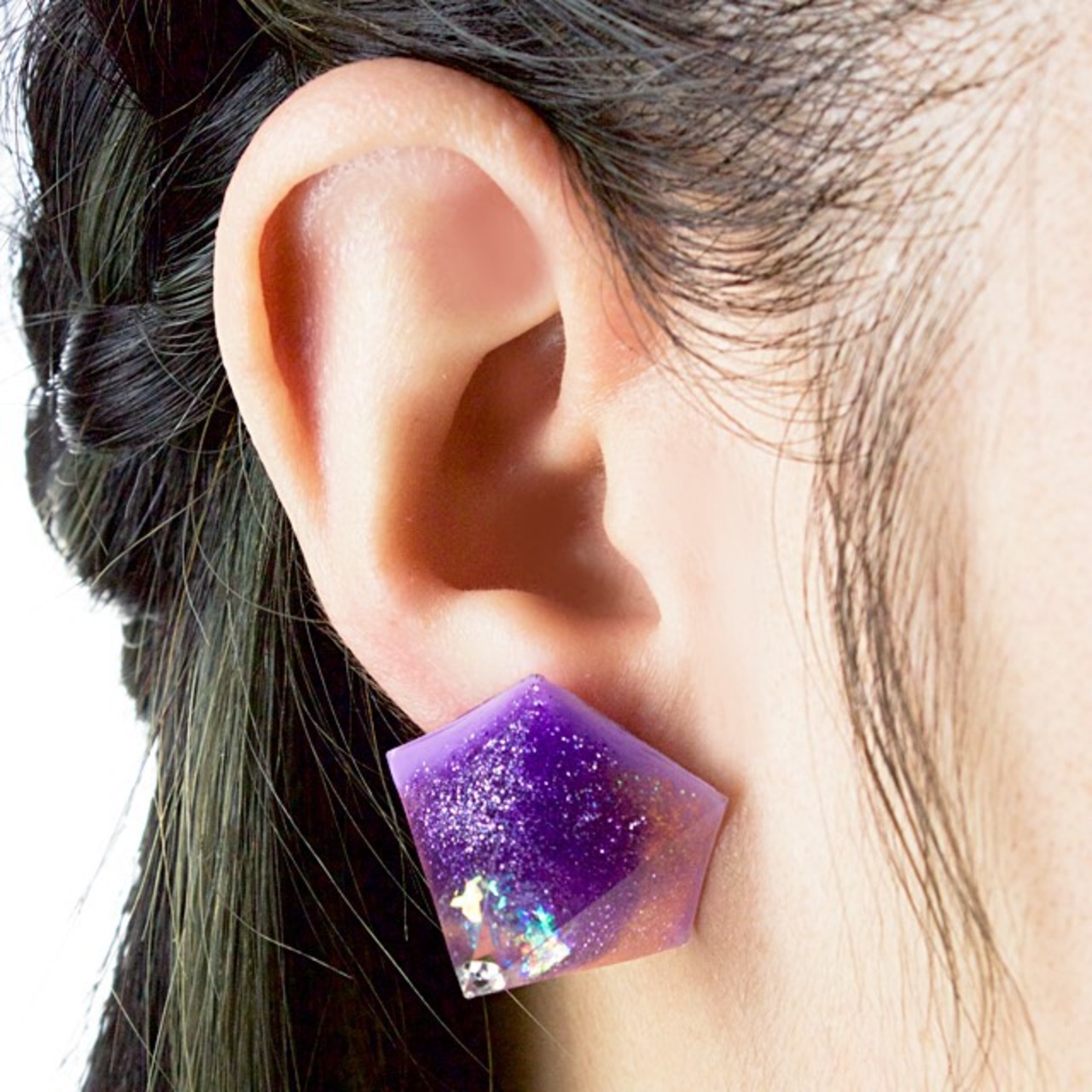 パープル、ゴールド、ピンクなどをクリスタルレジンで閉じ込めたペンタゴン型のピアスです。先端にはガラスストーンが入り輝いています!