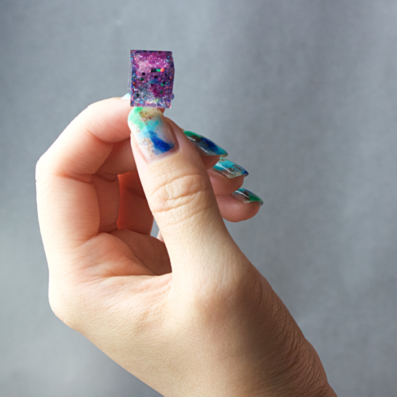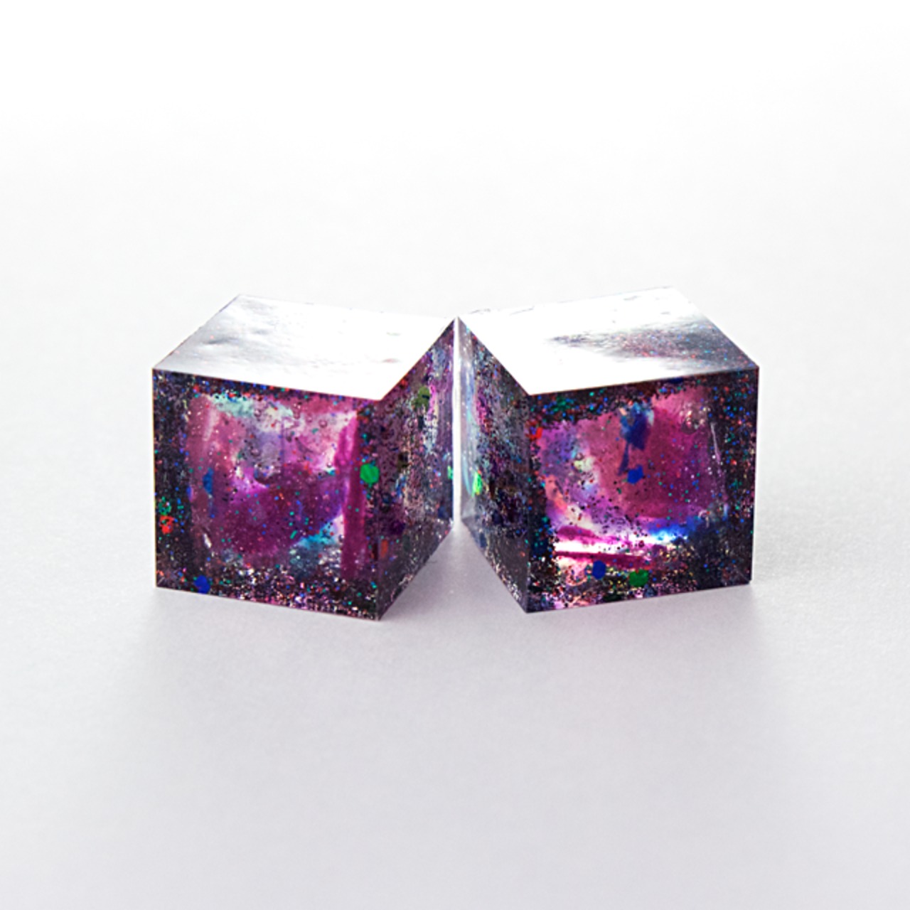様々なカラーが何層にも重なった不思議な雰囲気のクリスタルレジンを用いたキューブ型のピアスです。