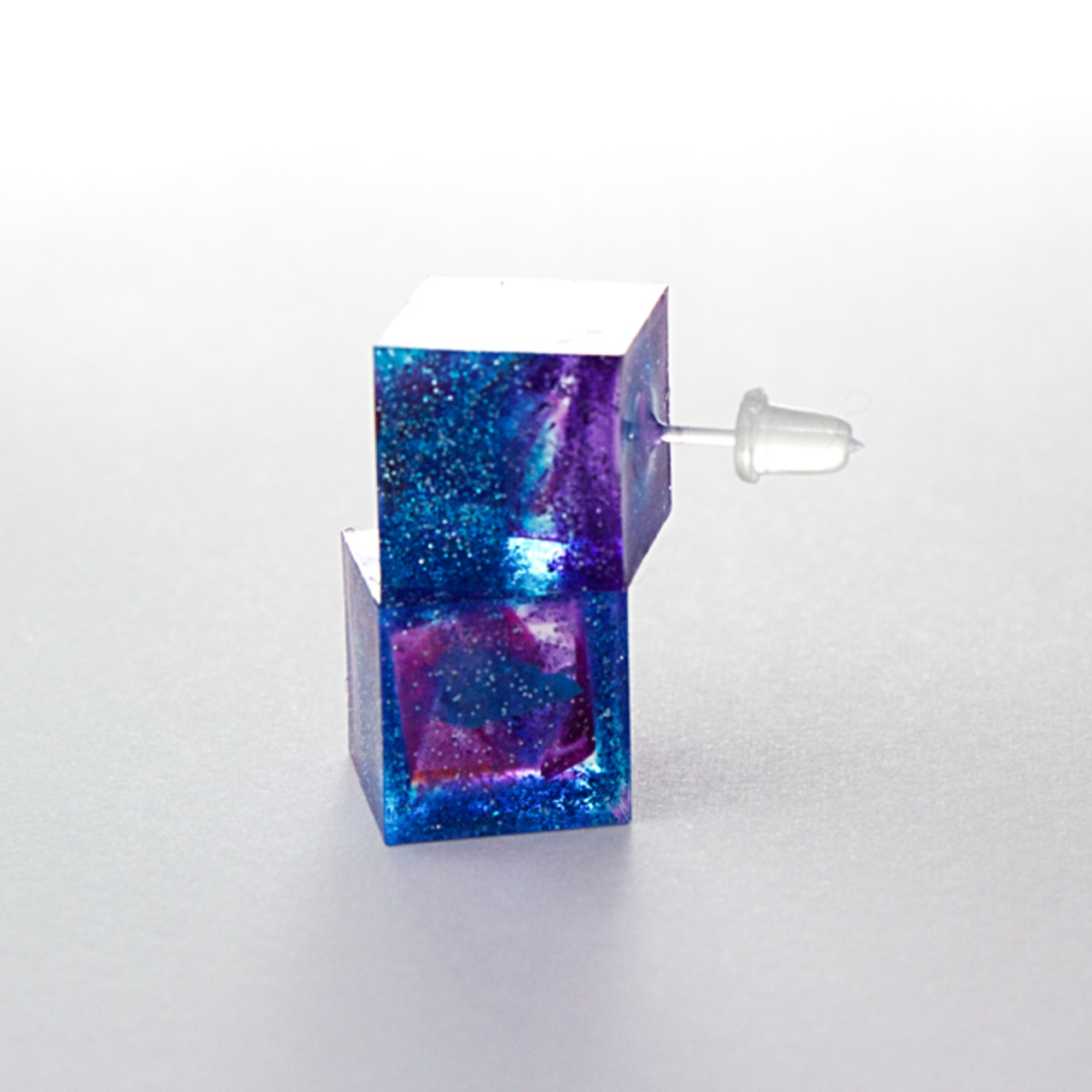 様々なカラーが何層にも重なった不思議な雰囲気のクリスタルレジンを用いたキューブ型のピアスです。