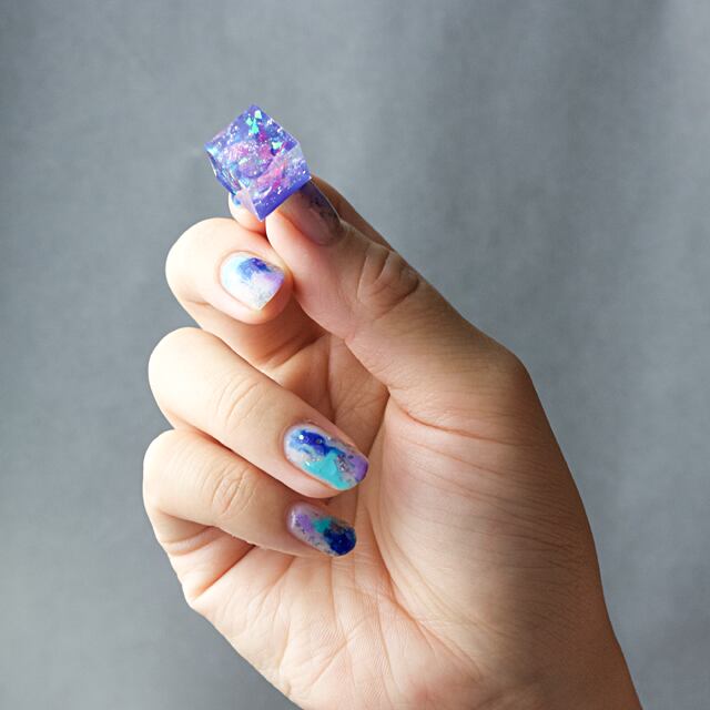 様々なカラーが何層にも重なった不思議な雰囲気のクリスタルレジンを用いたキューブ型のピアスです。