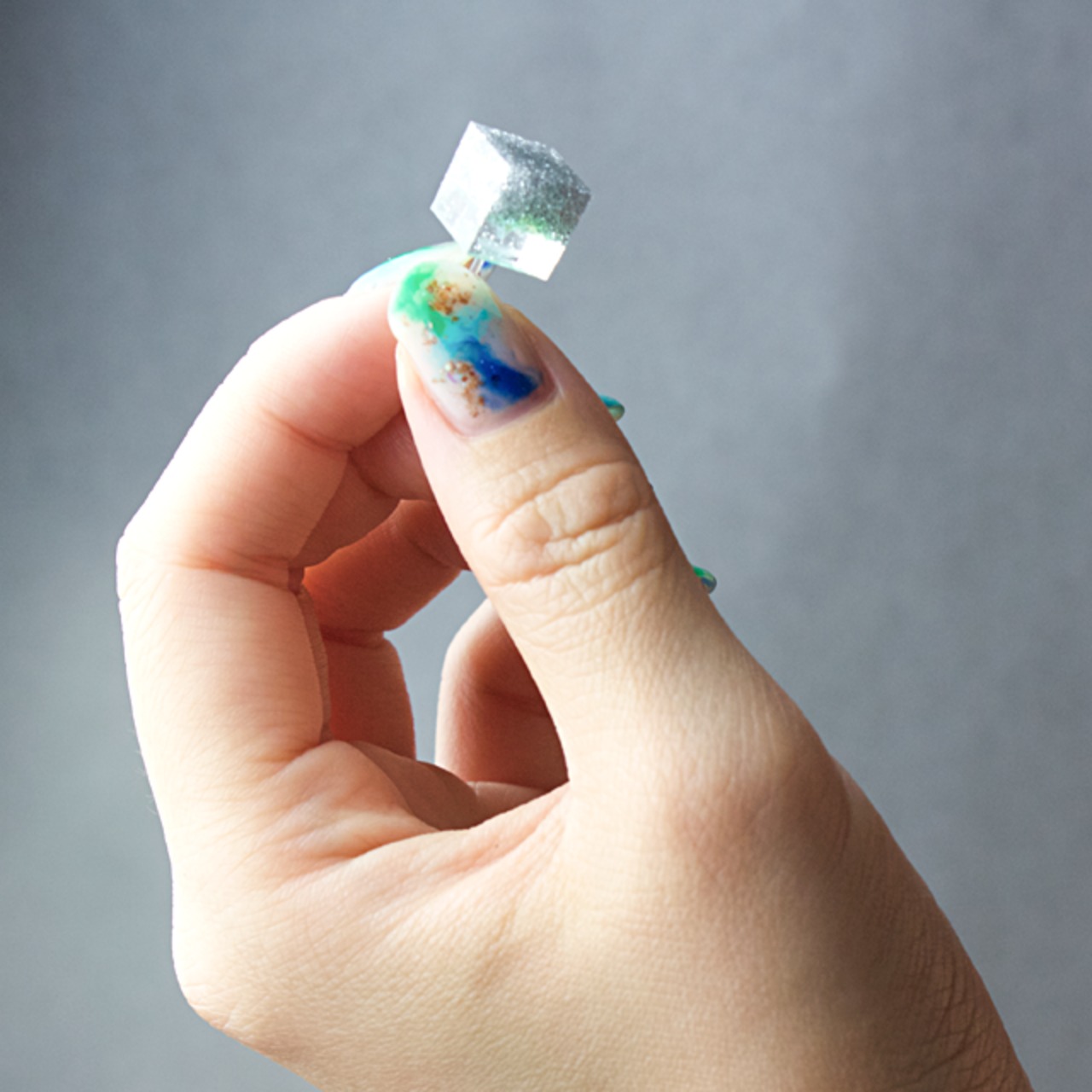 クリア、ライトブルー、シルバーの層になったクリスタルレジンを用いたキューブ型のピアスです。