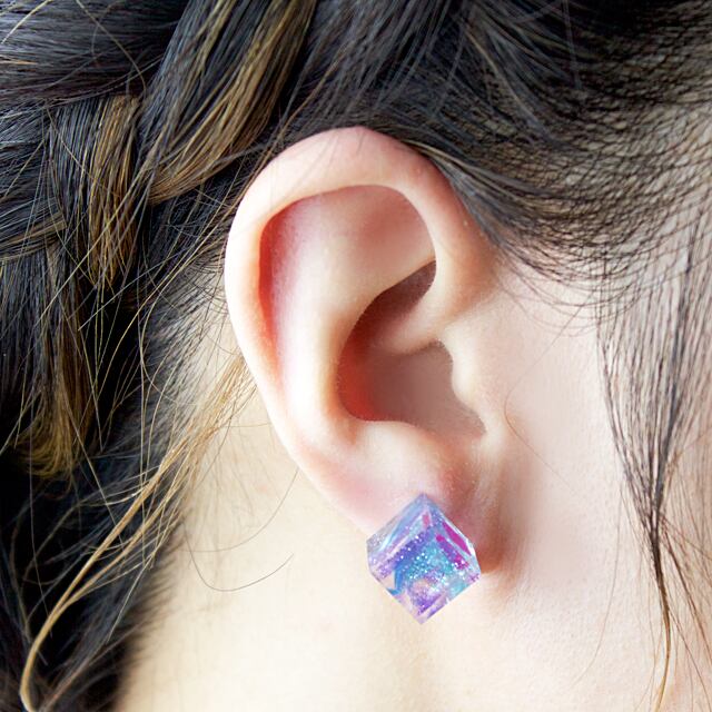 クリスタルレジンを用いたパープル系のカラーリングのキューブ型ピアスです。