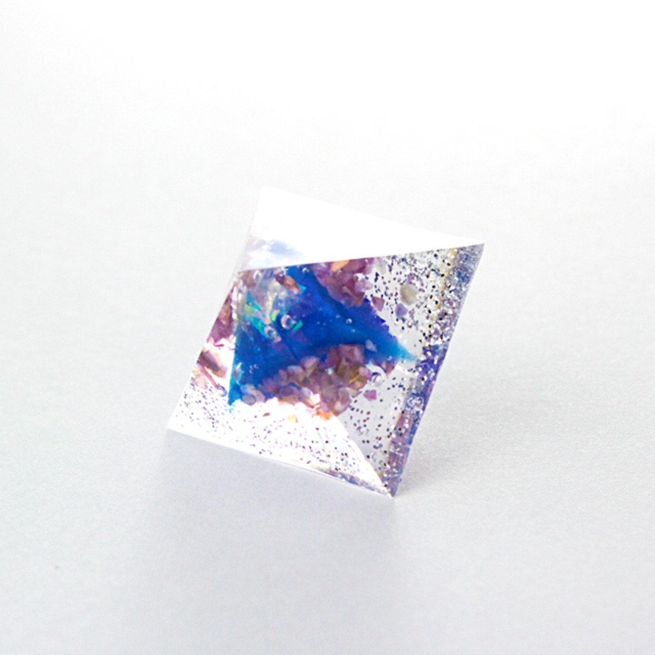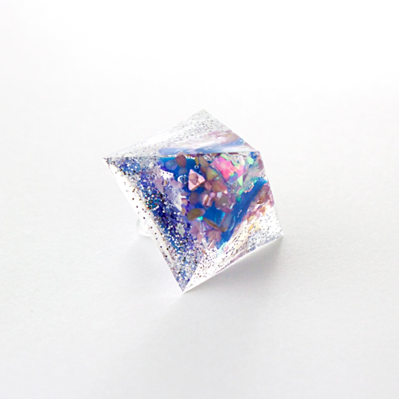 ブルーの三角錐を贅沢にクリスタルレジンで閉じ込めたピラミッド型のピアスです。