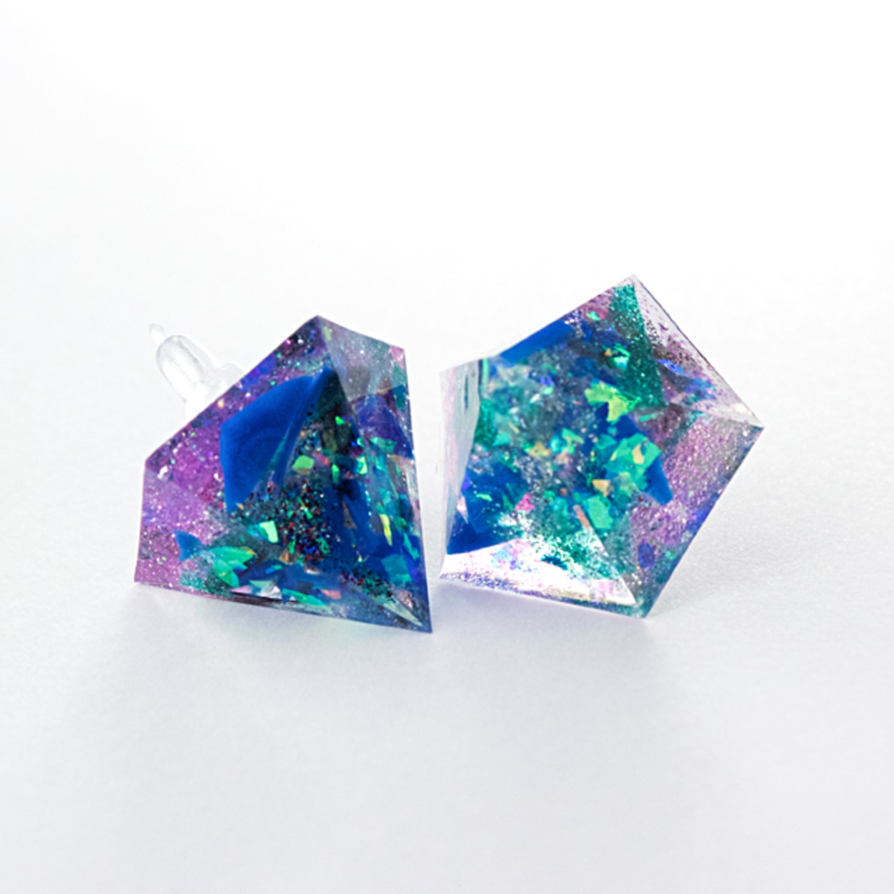 オーロラやブルーの欠片をクリスタルレジンで閉じ込めたペンタゴン型のピアスです。