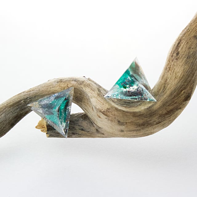 グリーンとブラックの欠片、ラメなどをクリスタルレジンで閉じ込めた三角錐型のピアスです。