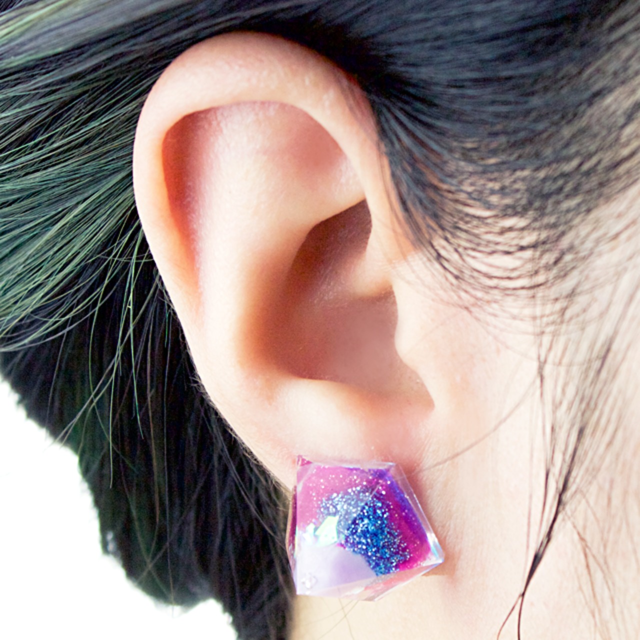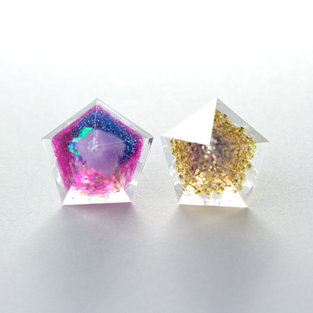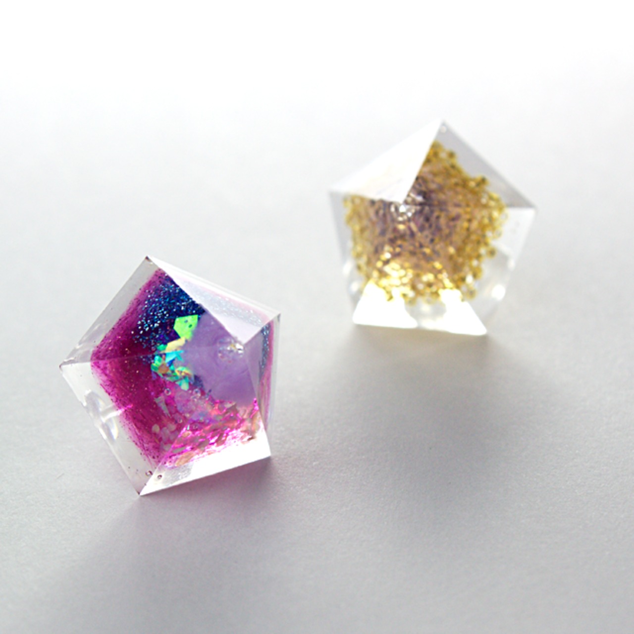 様々なカラー、ラメやシェルをクリスタルレジンで閉じ込めたペンタゴン型のピアスです。