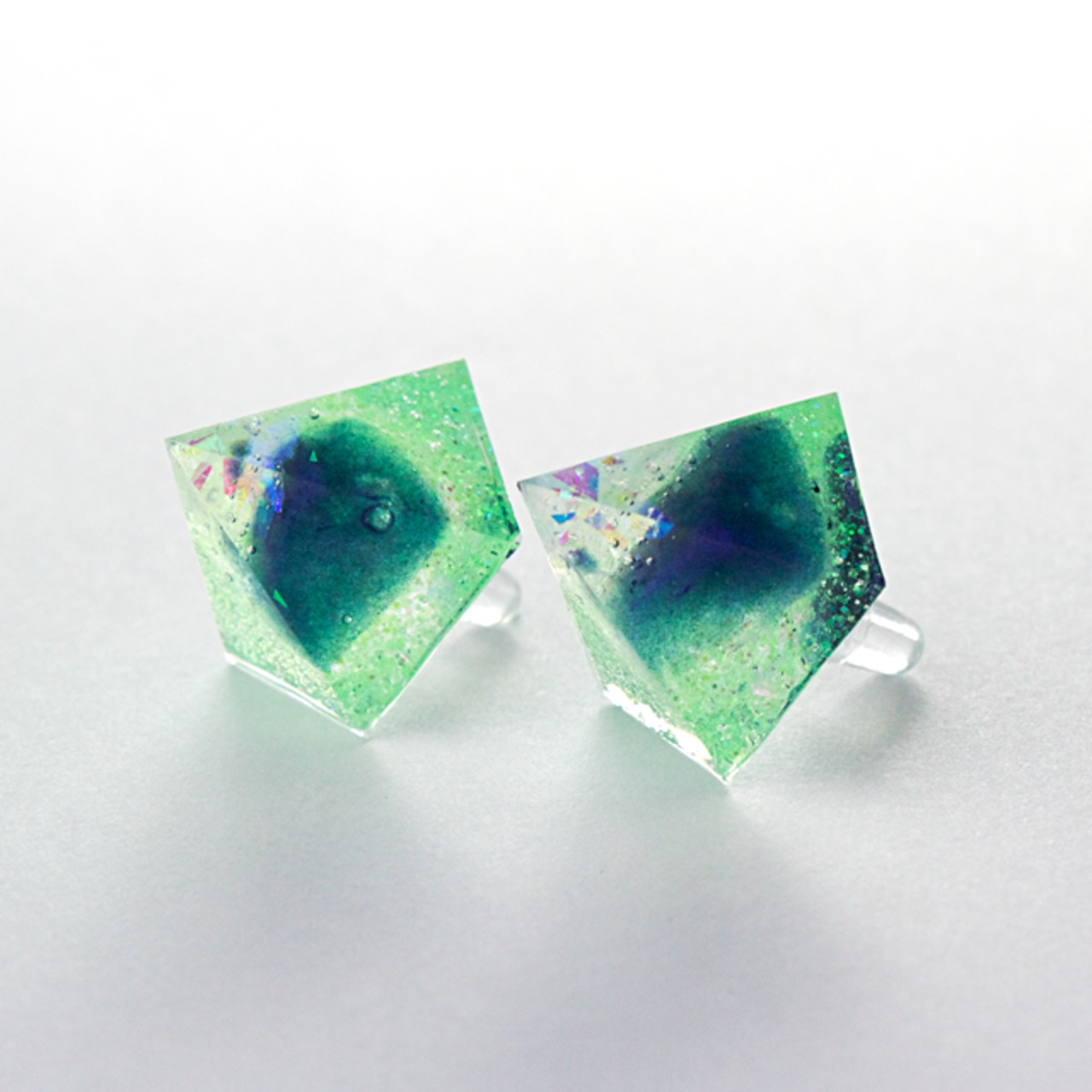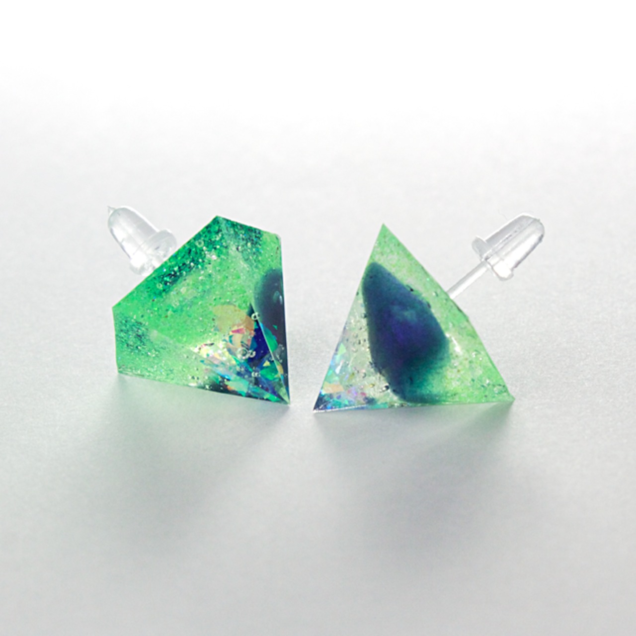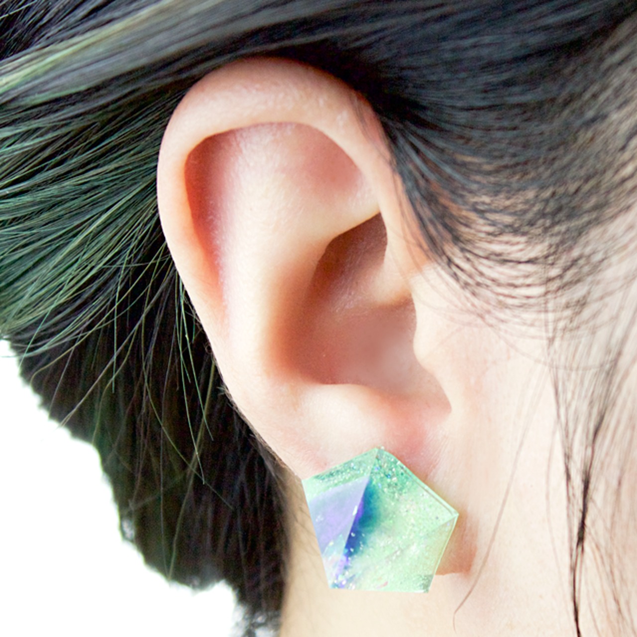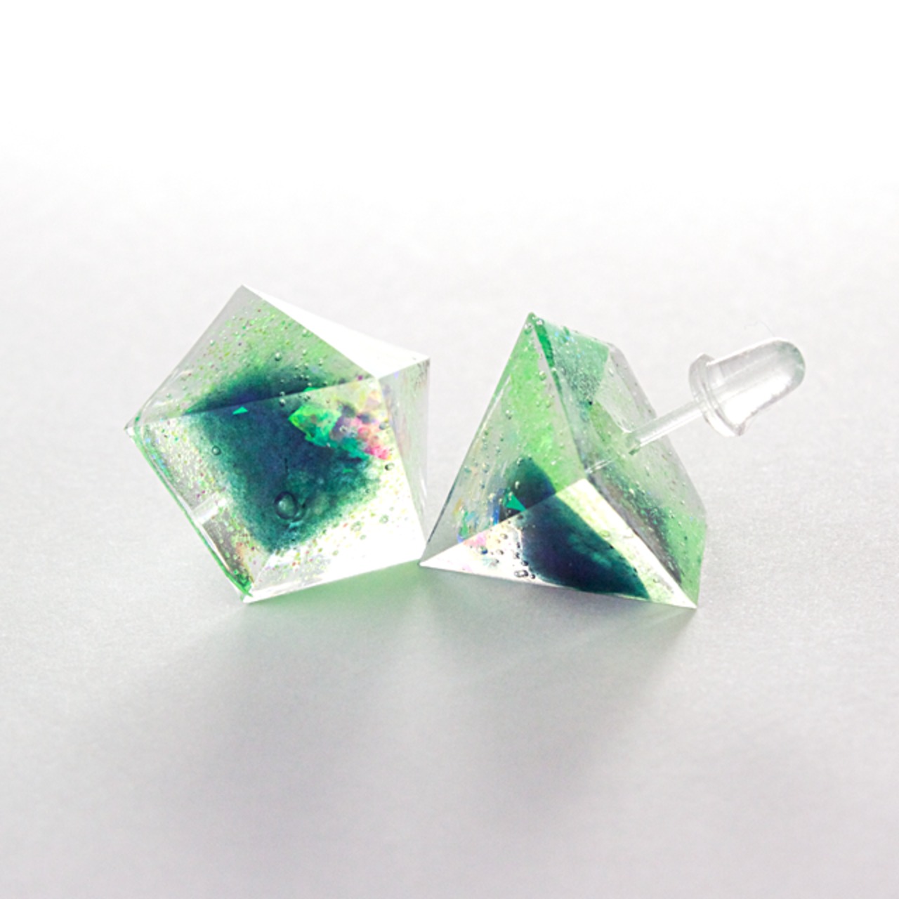 ブルーとグリーンや偏光のカラーとオーロラをクリスタルレジンで閉じ込めたペンタゴン型のピアスです。