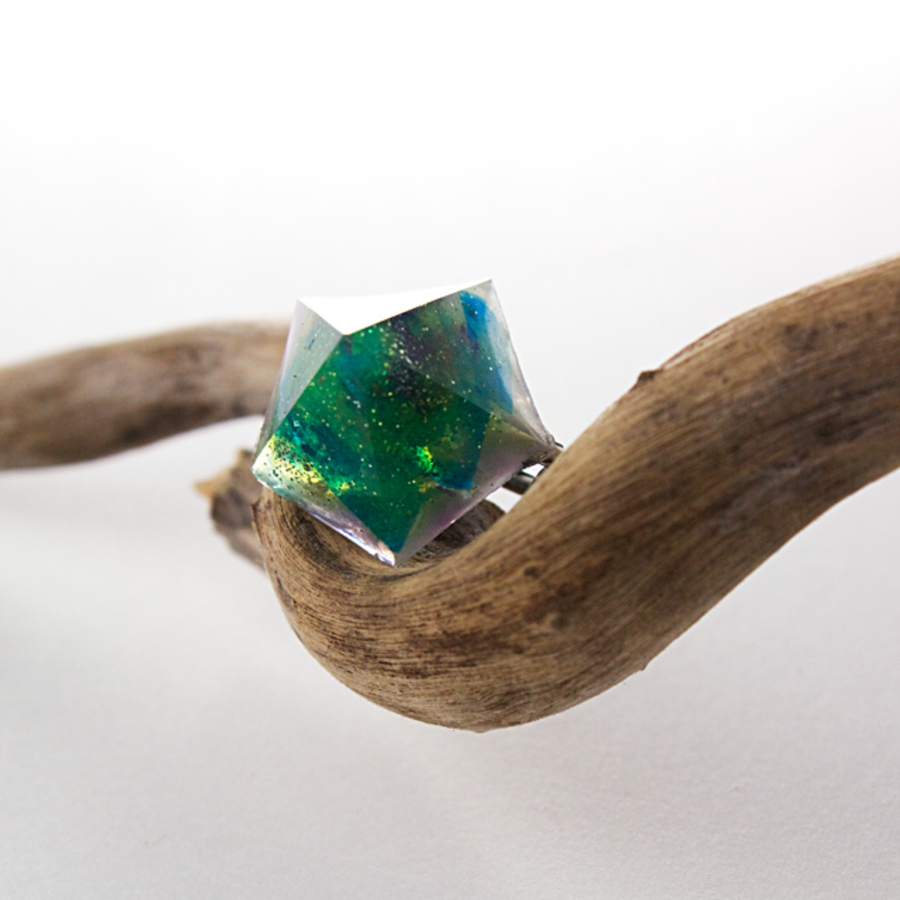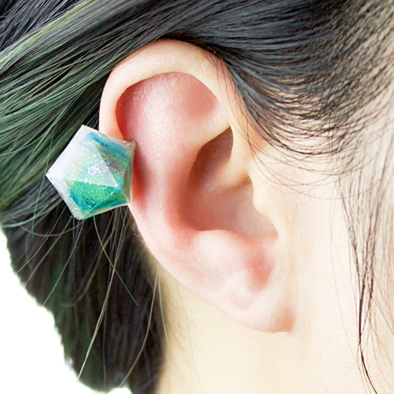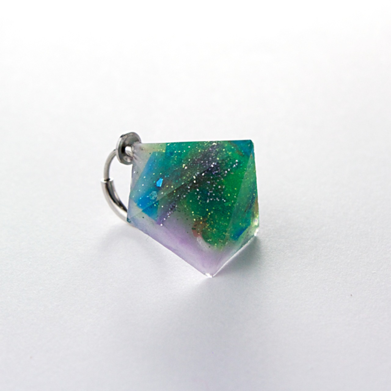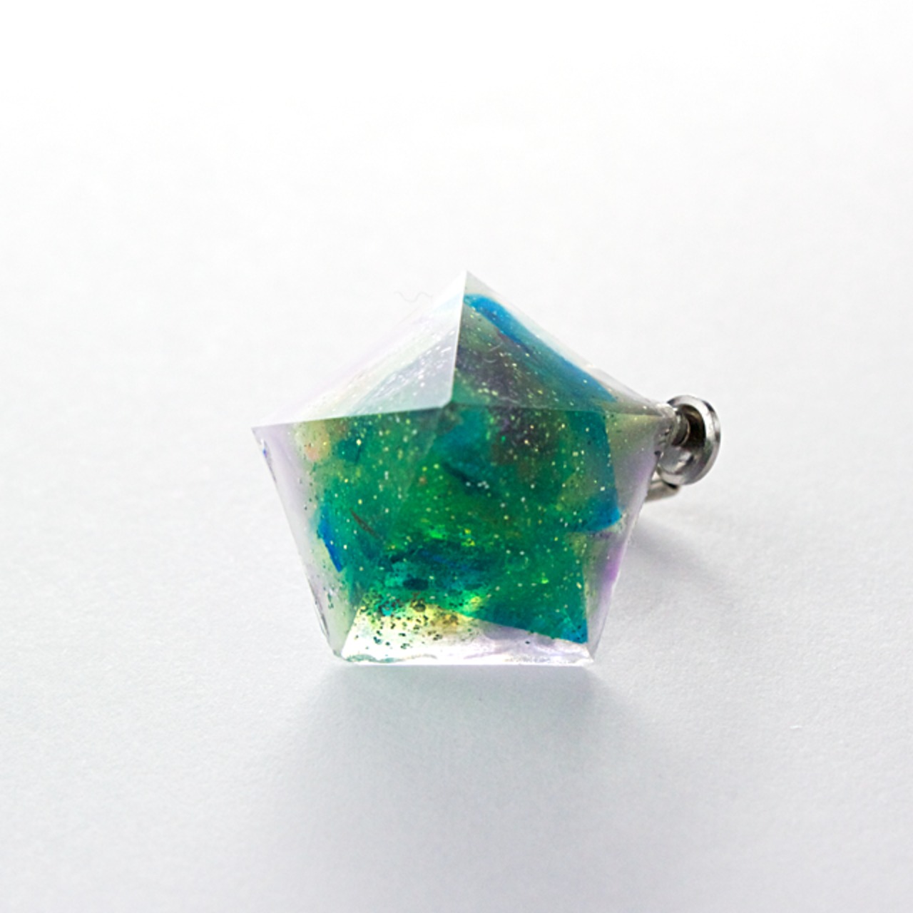 様々なカラーの破片とグリーン、オーロラなどをクリスタルレジンで閉じ込めたペンタゴン型のイヤリングです。