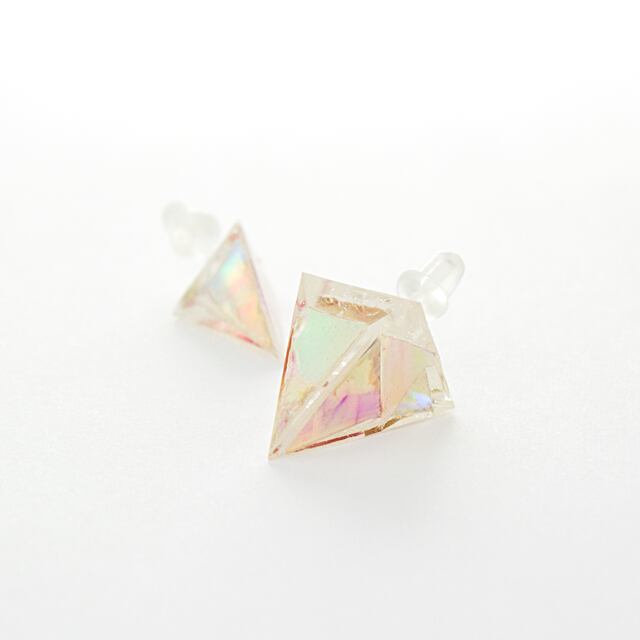 DVDの破片を閉じ込めたクリスタルレジンのピラミッドとトライアングル型のピアスです。