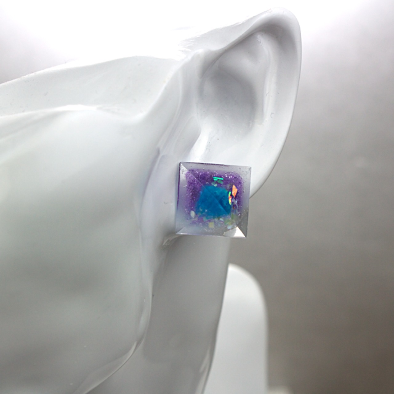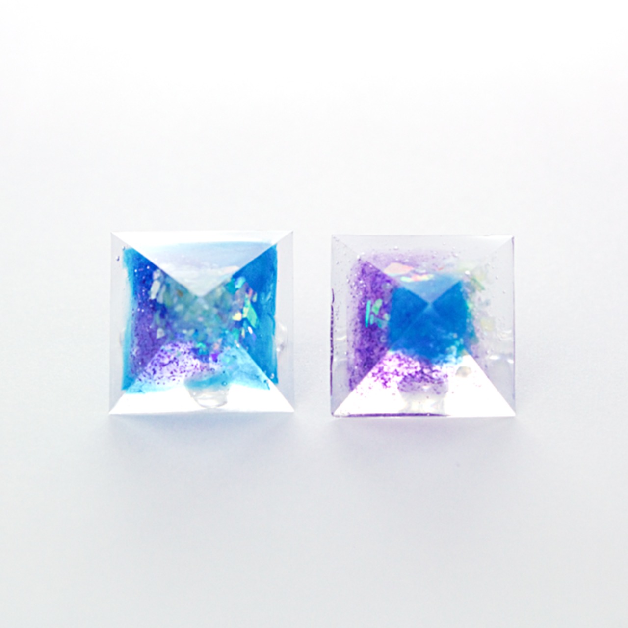 ブルーやパープル、薄いグリーンのシェル、オーロラをクリスタルレジンで閉じ込めたピラミッド型のピアスです。