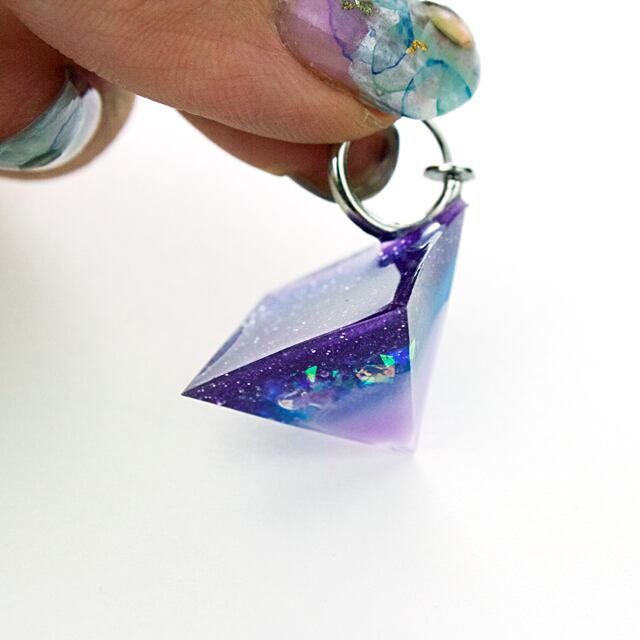 ブルーとパープルなどをクリスタルレジンで閉じ込めたペンタゴン型のイヤリングです。