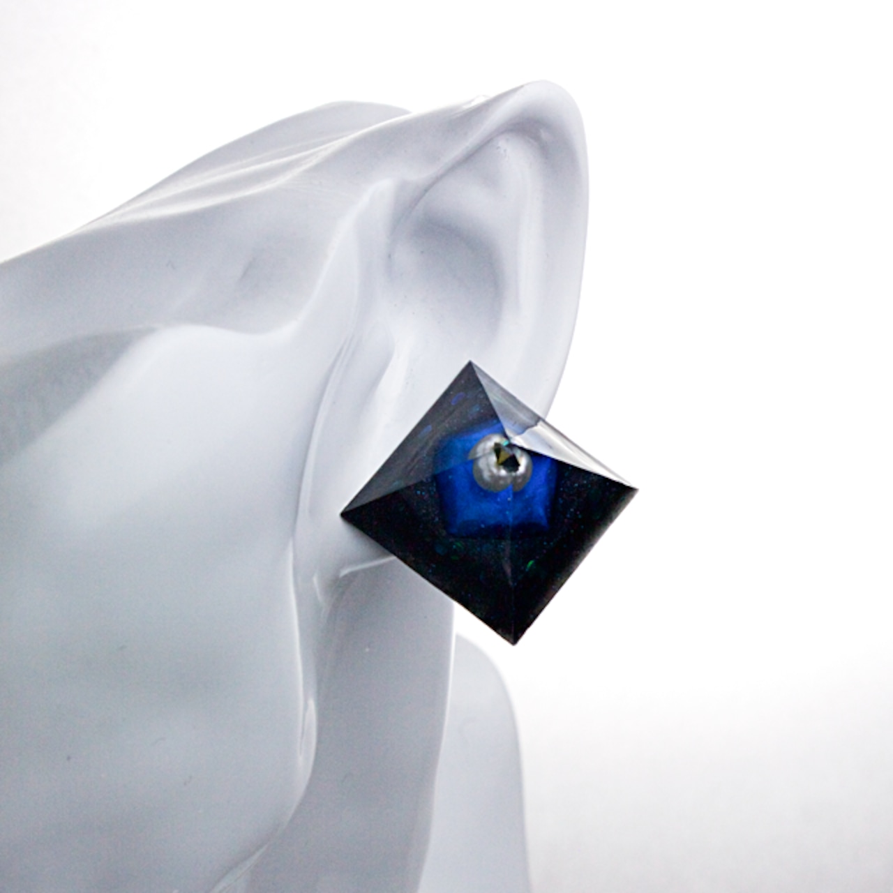大きなピラミッドの中に鋭角ピラミッドをクリスタルレジンで閉じ込めたピラミッド型イヤリングです。