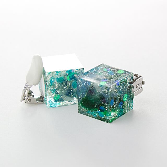 様々なカラーが何層にも重なった不思議な雰囲気のクリスタルレジンを用いたキューブ型のクリップタイプのイヤリングです。