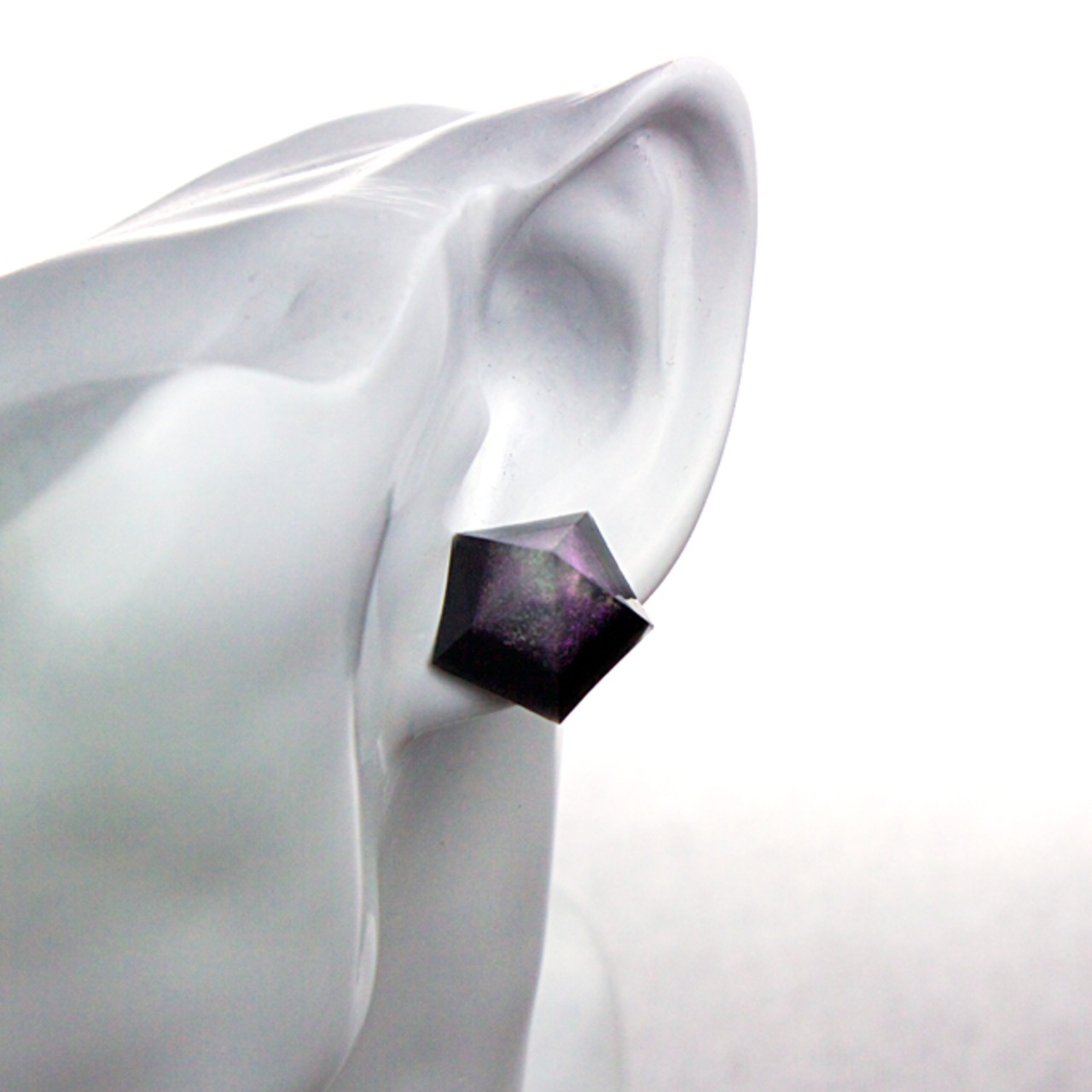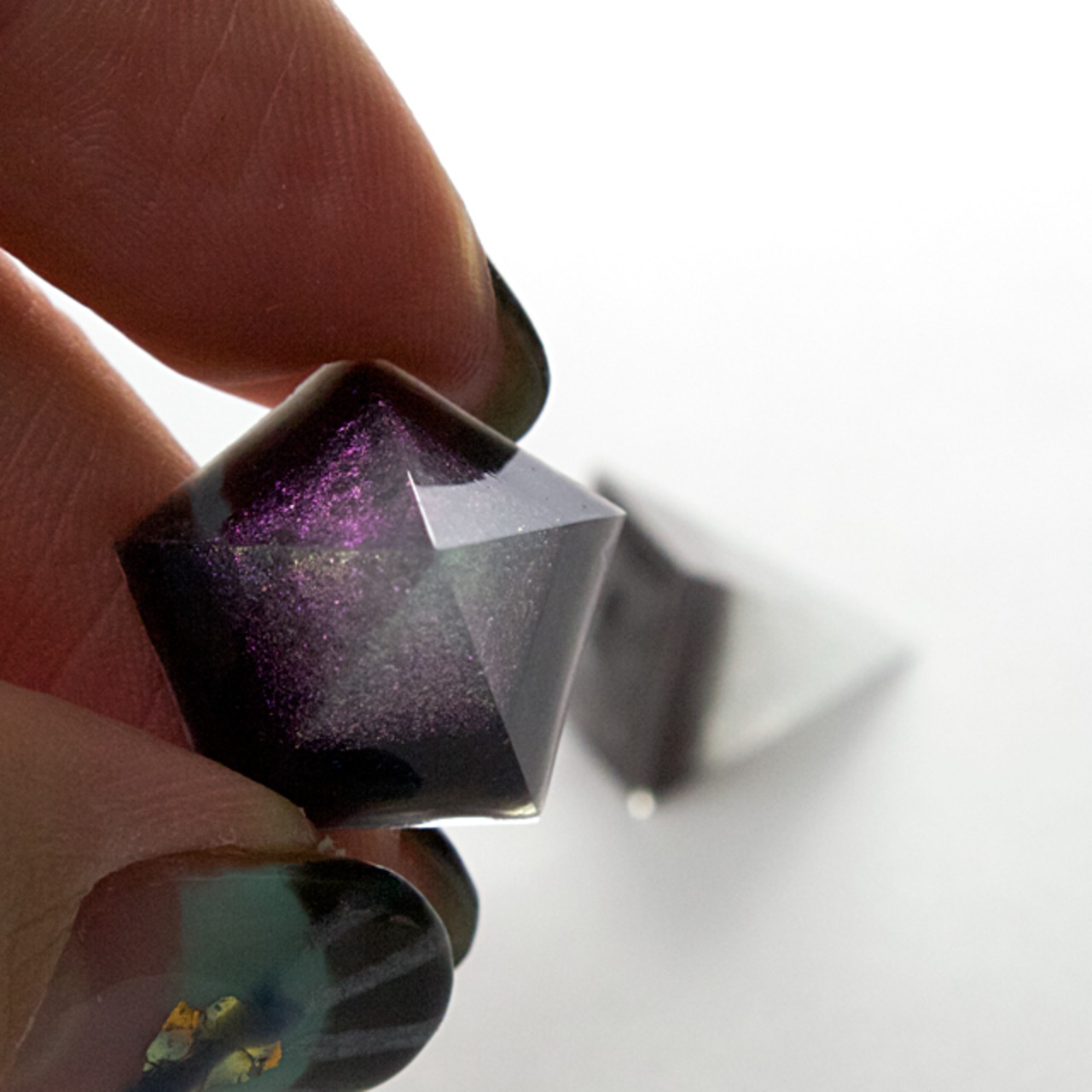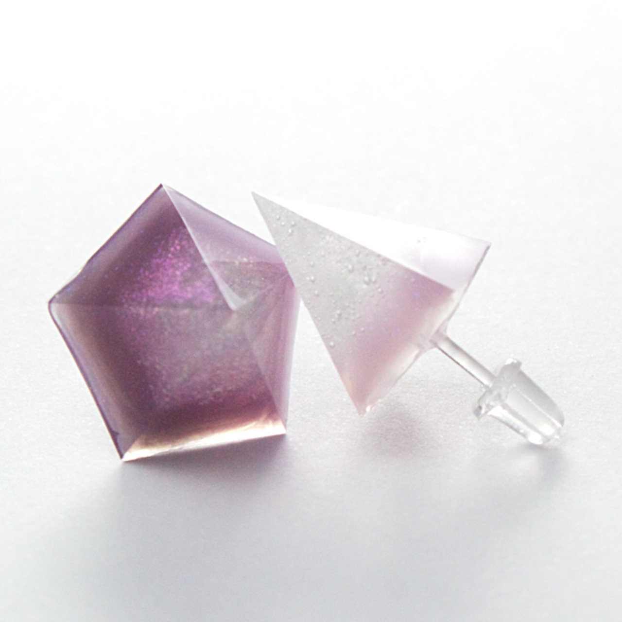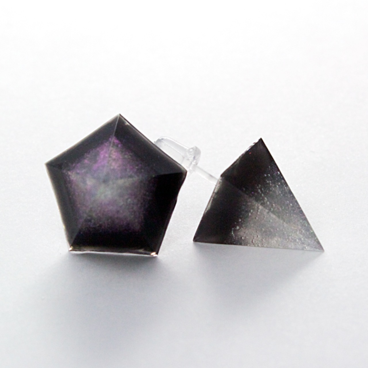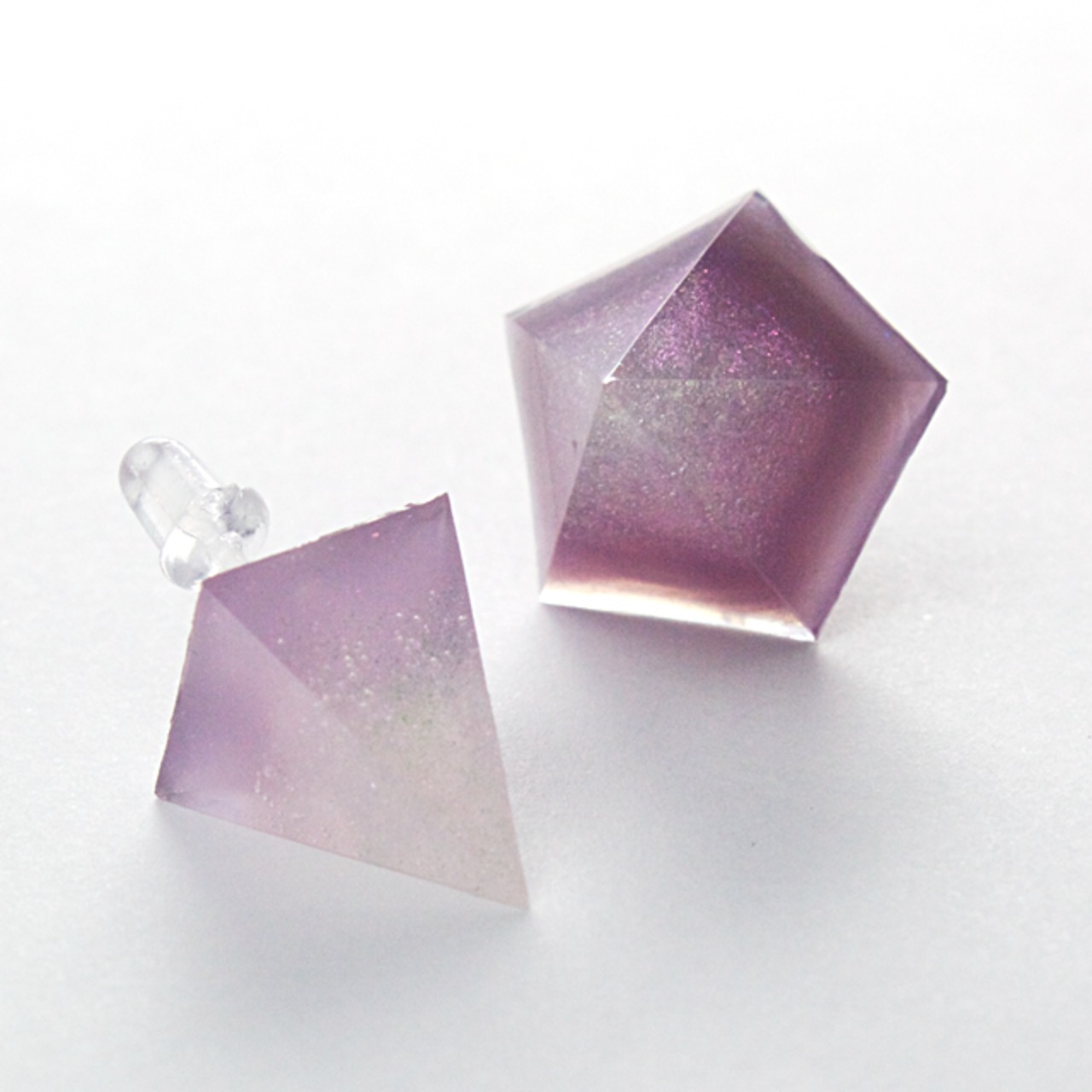 インク2種類とラメなどをクリスタルレジンで閉じ込めたペンタゴン型と鋭角ピラミッド型のピアスです。